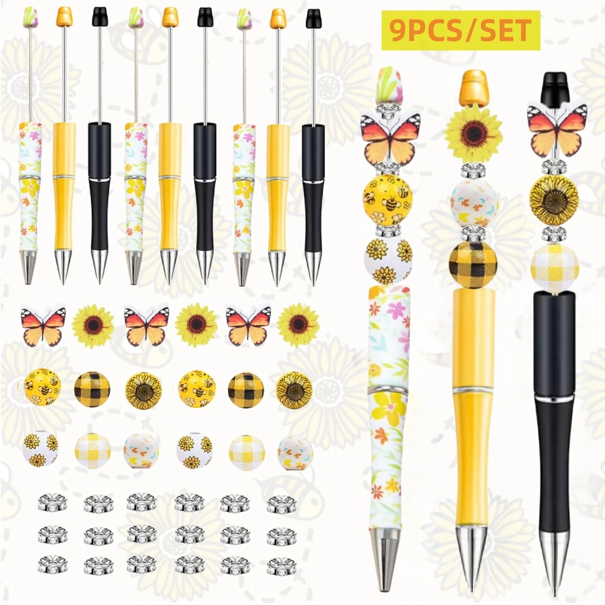 9 PCS Colorful Spring Sunflower, Butterfly Themed DIY Bead Ballpoint Pens, Suitable As Party Birthda...