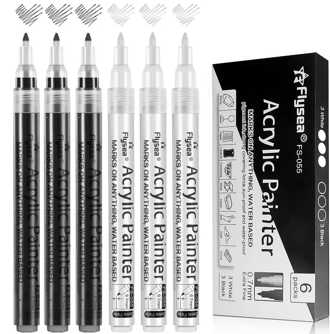 6Pcs Black White Gold Silvery Acrylic Paint Pens, Acrylic Paint Markers 0.7 mm Extra Fine,3 mm Mediu...