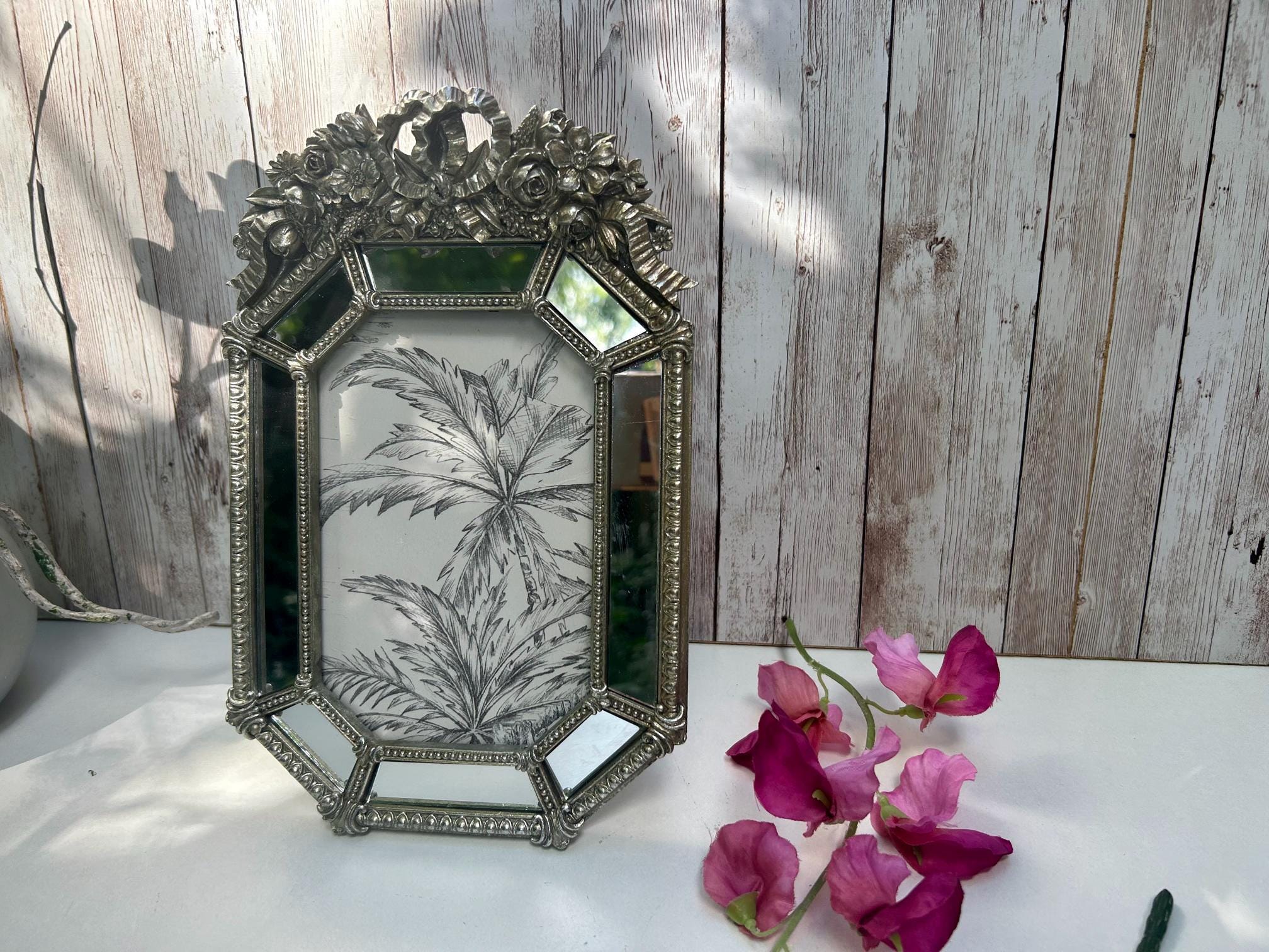 "This stunning photo frame is in the art deco style. The frame features 8 mirrored glass panels...