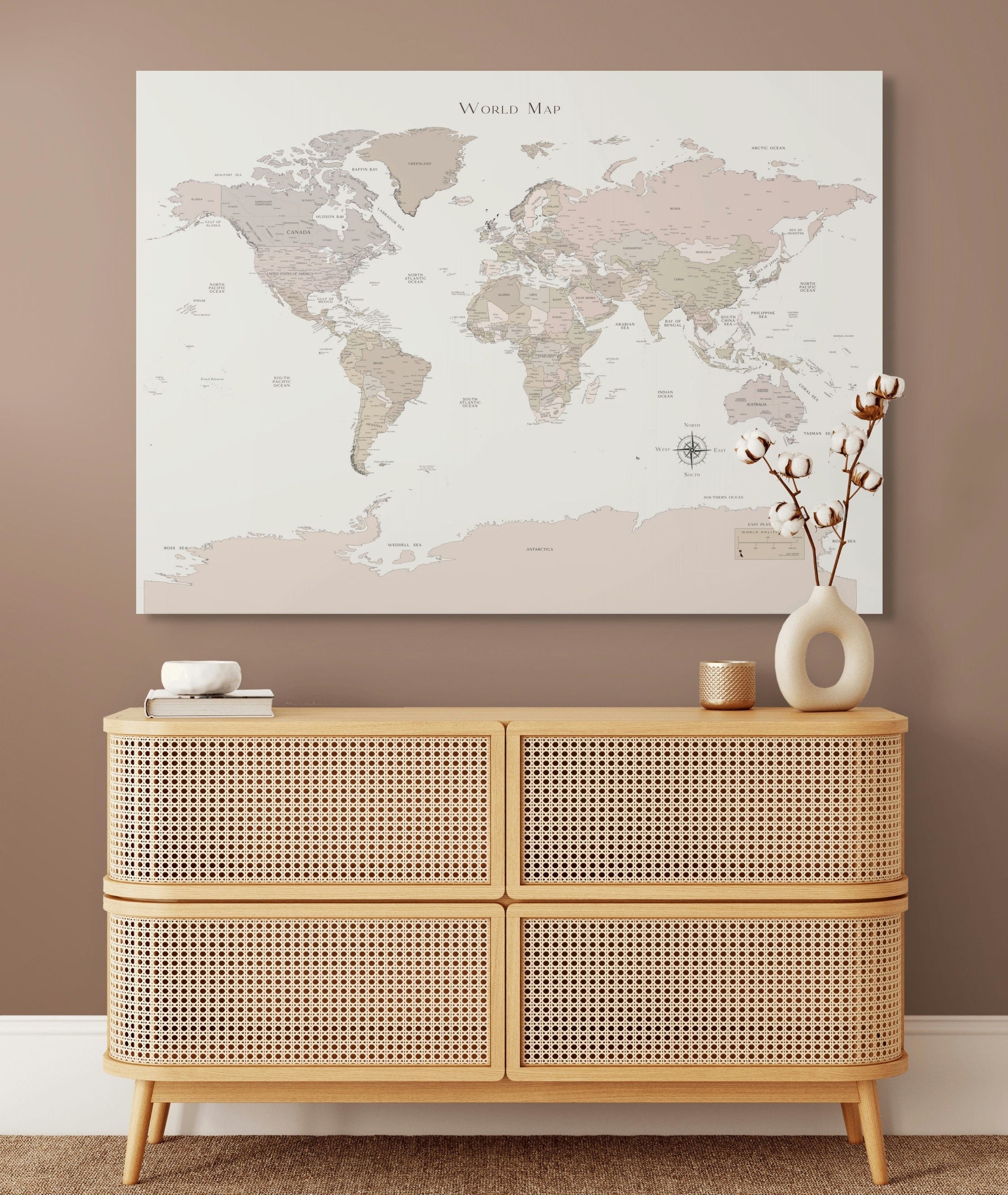 Printable Detailed World Map Muted Neutral Tone Beige for Boho Home...