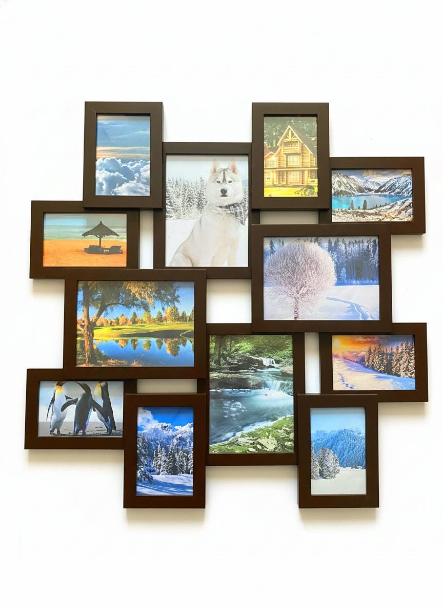 Handmade wooden collage photo frame in dark brown color for 12 phot...