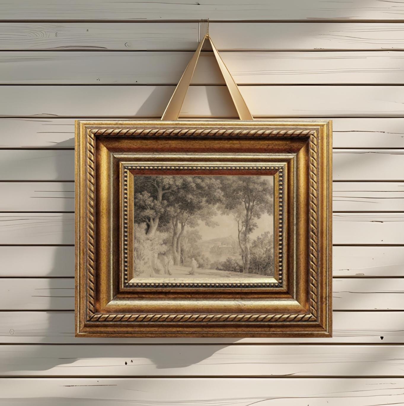 "Black dot studio Vintage drawing of a rural landscape framed in an elegant ornate gold frame i...