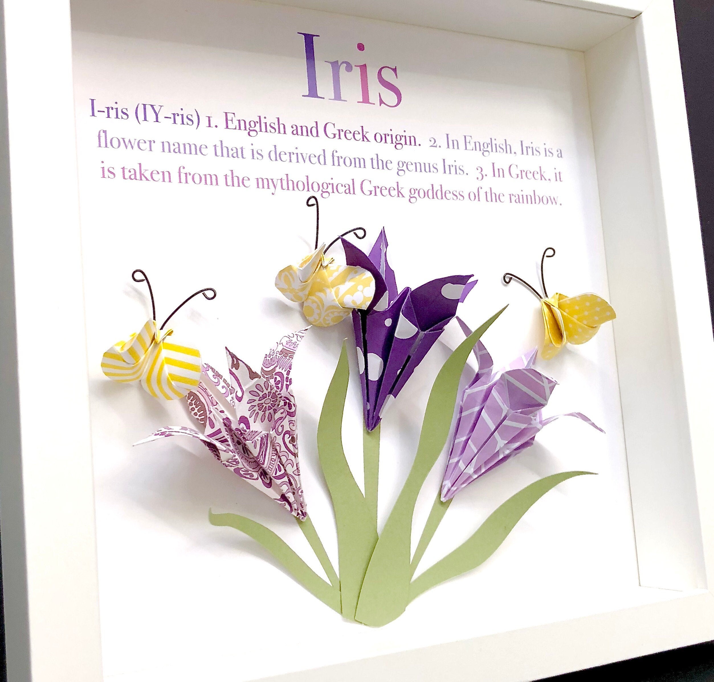 "This personalized name shadowbox features beautiful hand-made paper origami irises and butterf...