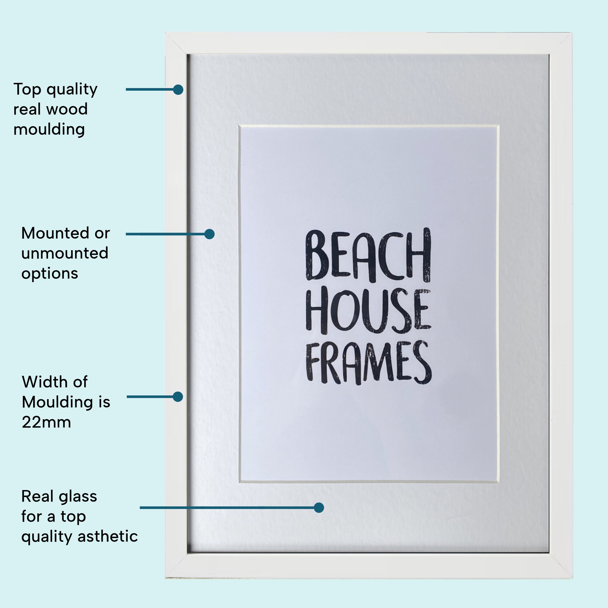 "All our picture frames include REAL GLASS and REAL SOLID WOOD (no MDF, no plastic, no veneers)...