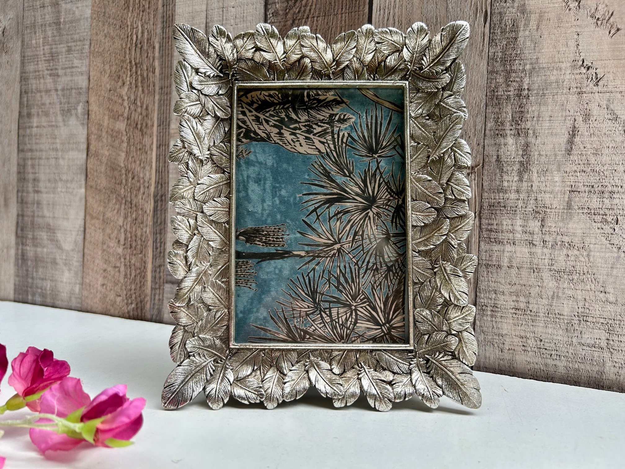 "This is a beautiful photo frame. The frame is decorated with silver coloured leaves around the...