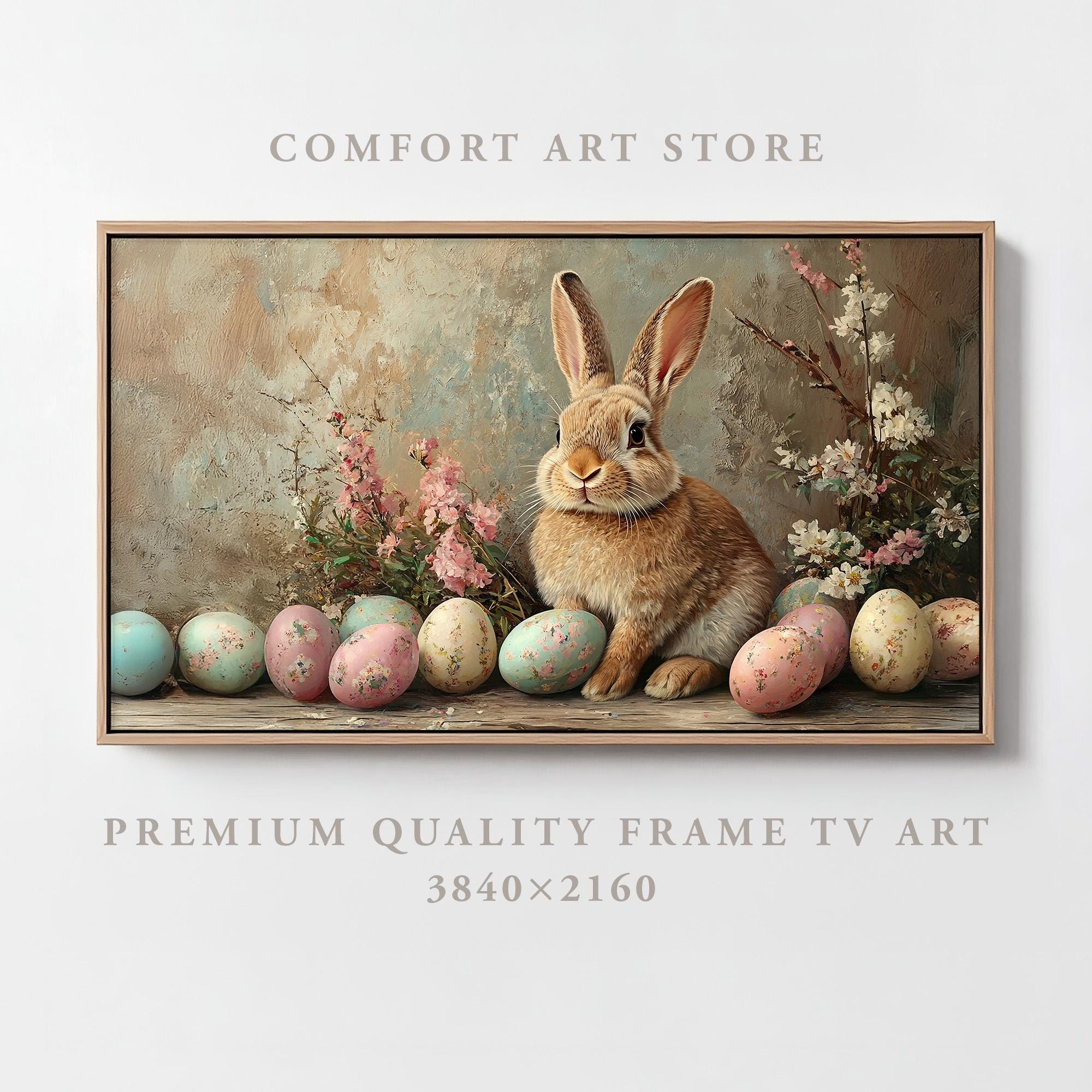"Easter Samsung Frame TV Art featuring a vintage oil painting of a charming Easter bunny sittin...