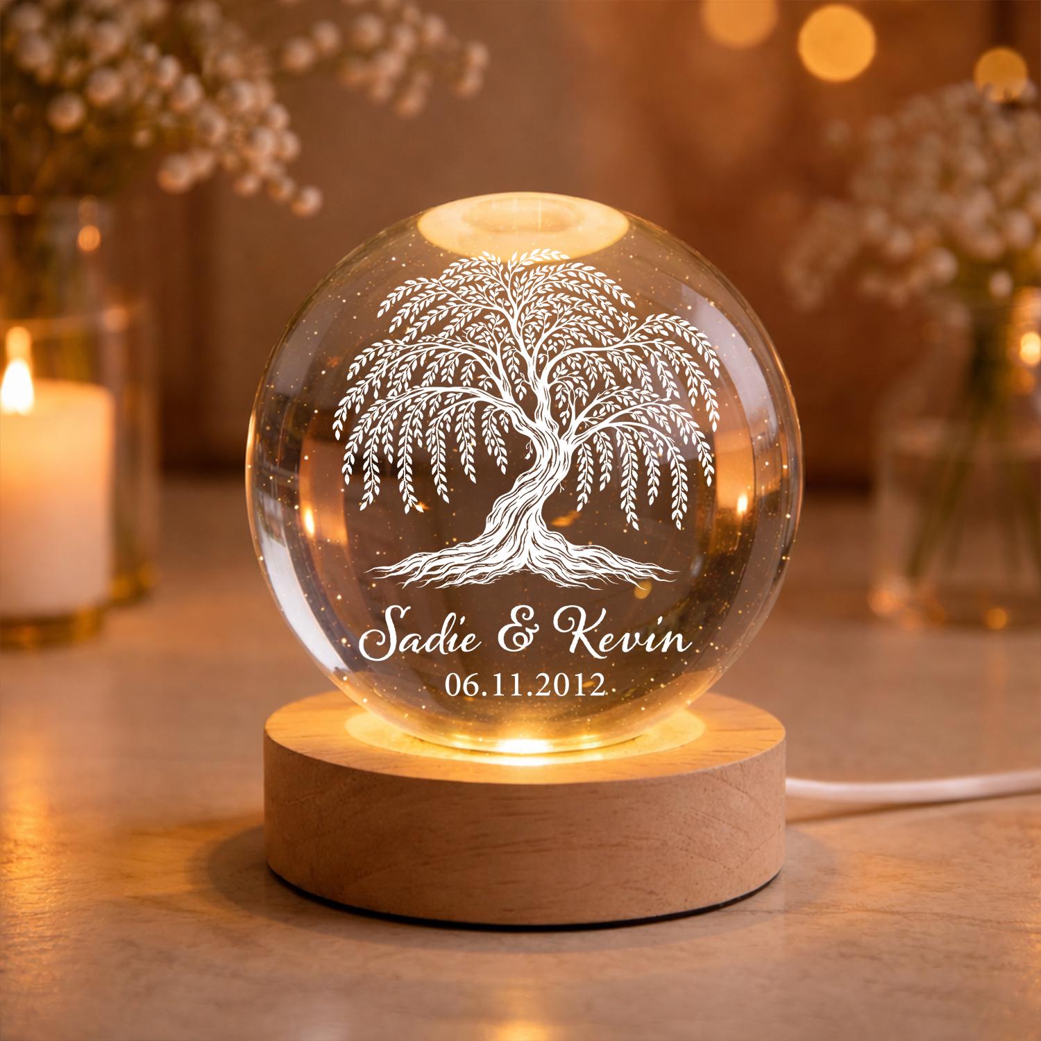 "Personalized Willow Tree Wedding Anniversary Gift, Custom Name and Date Crystal Ball Night Lig...