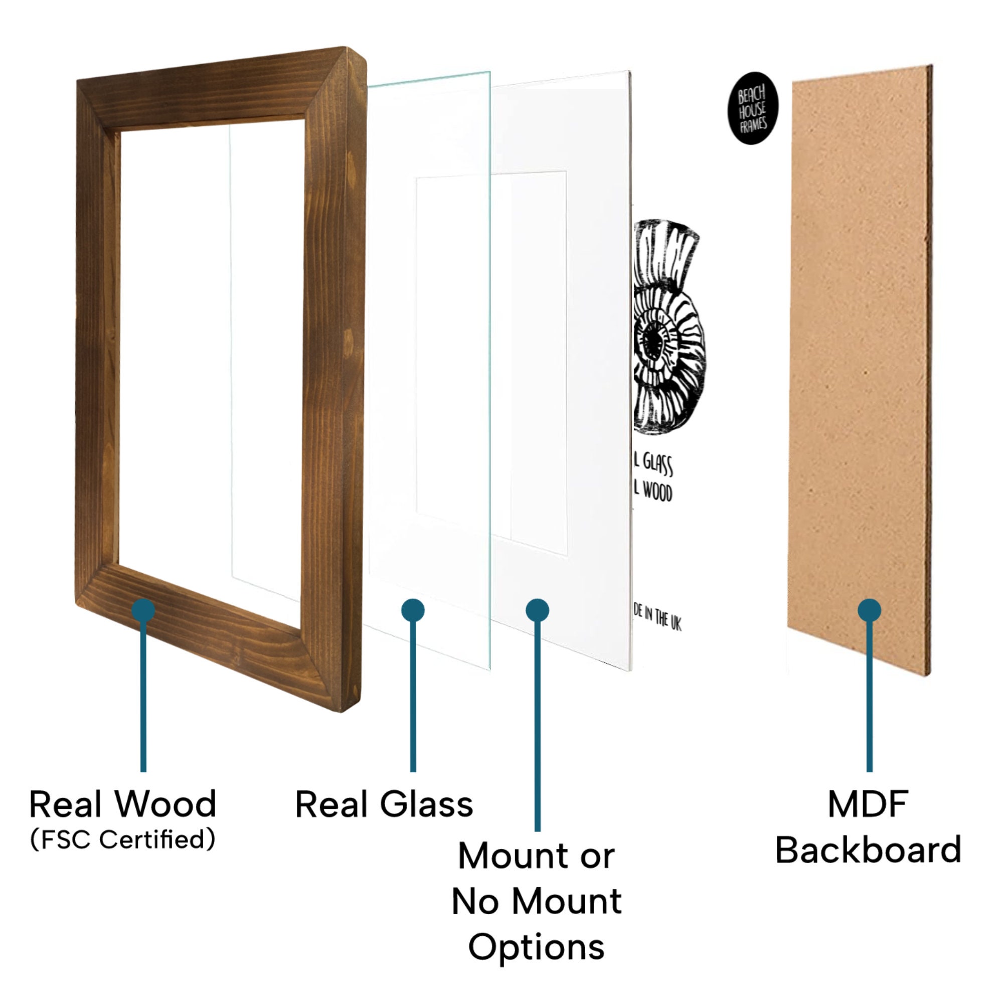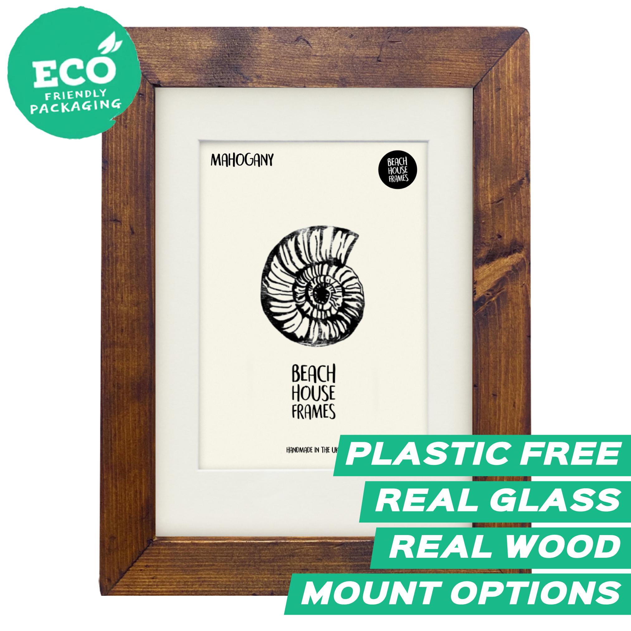 "All our picture frames include REAL GLASS and REAL SOLID WOOD (no MDF, no plastic, no veneers)...