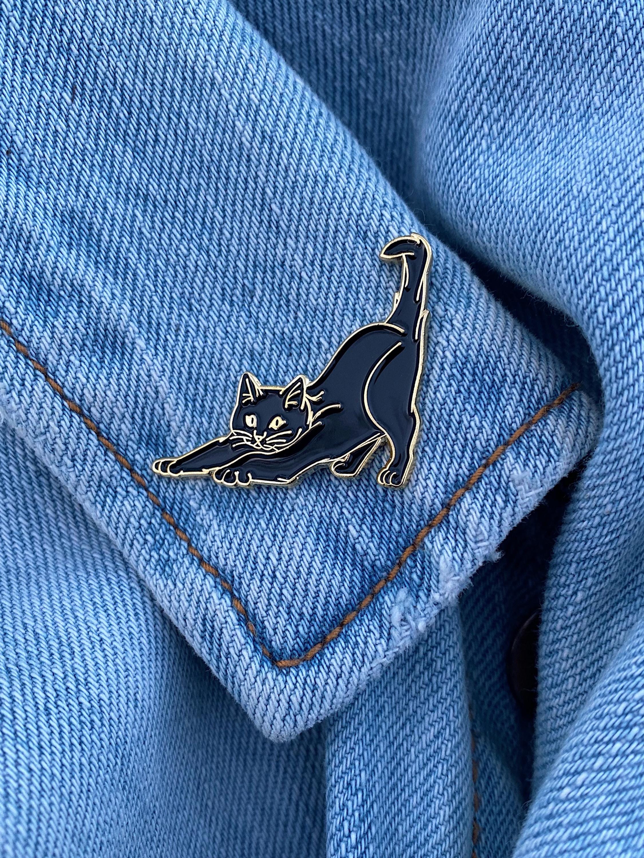 Black Cat Enamel Pin - Witch Cat Golden Brooch - Stretching Black C...