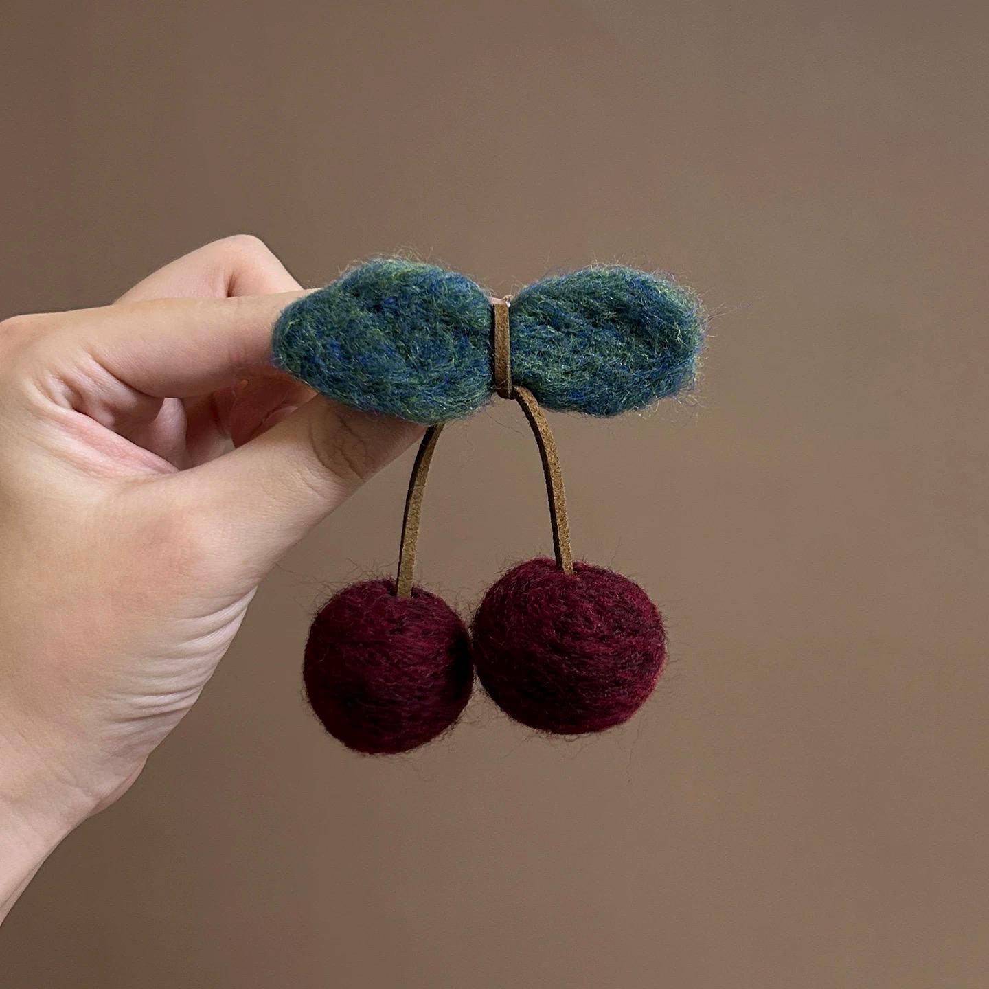 This handmade cherry brooch is crafted from wool felt, featuring two rich red cherries with soft gre...