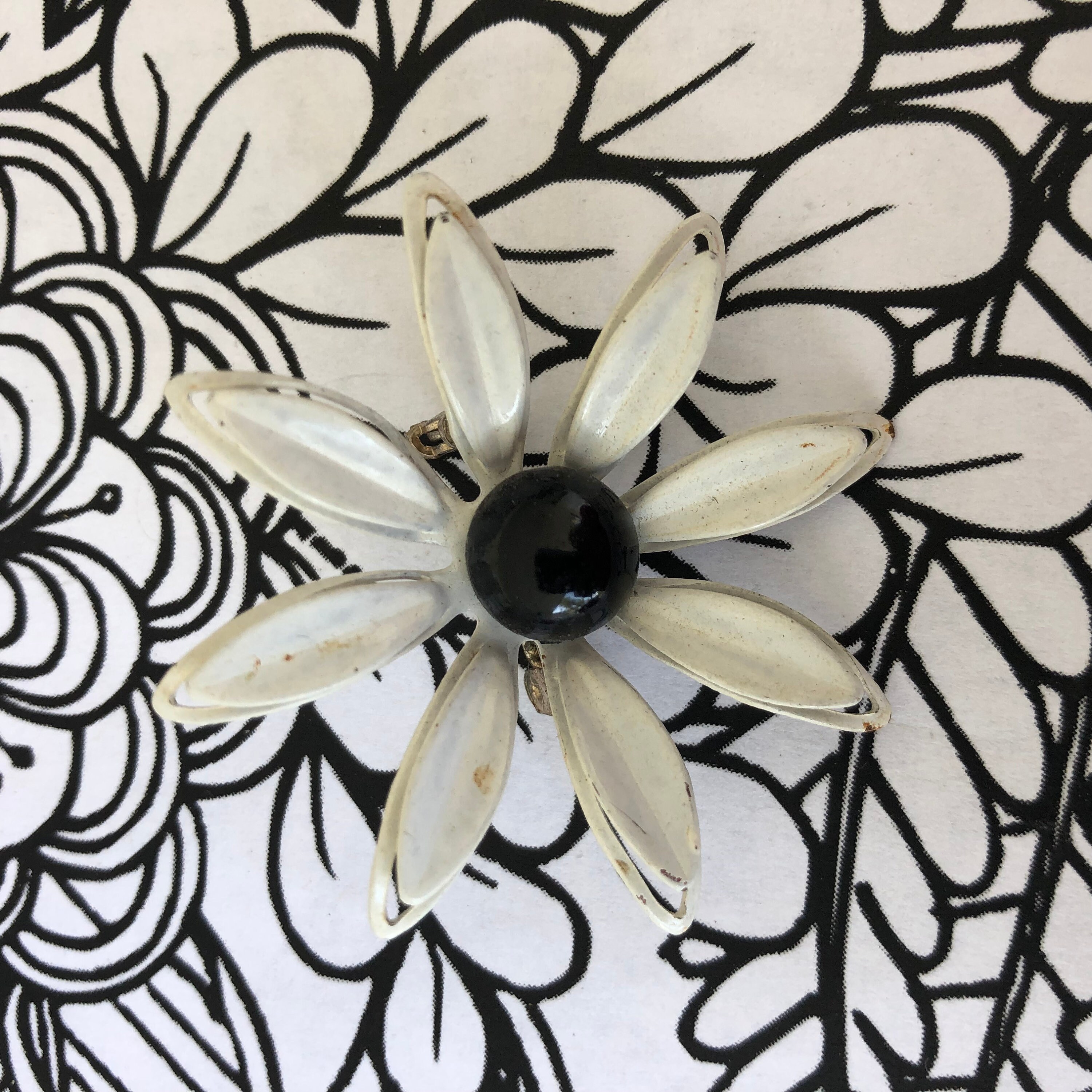 Medium black White 1960's enamel flower brooch, flower brooch, enam...