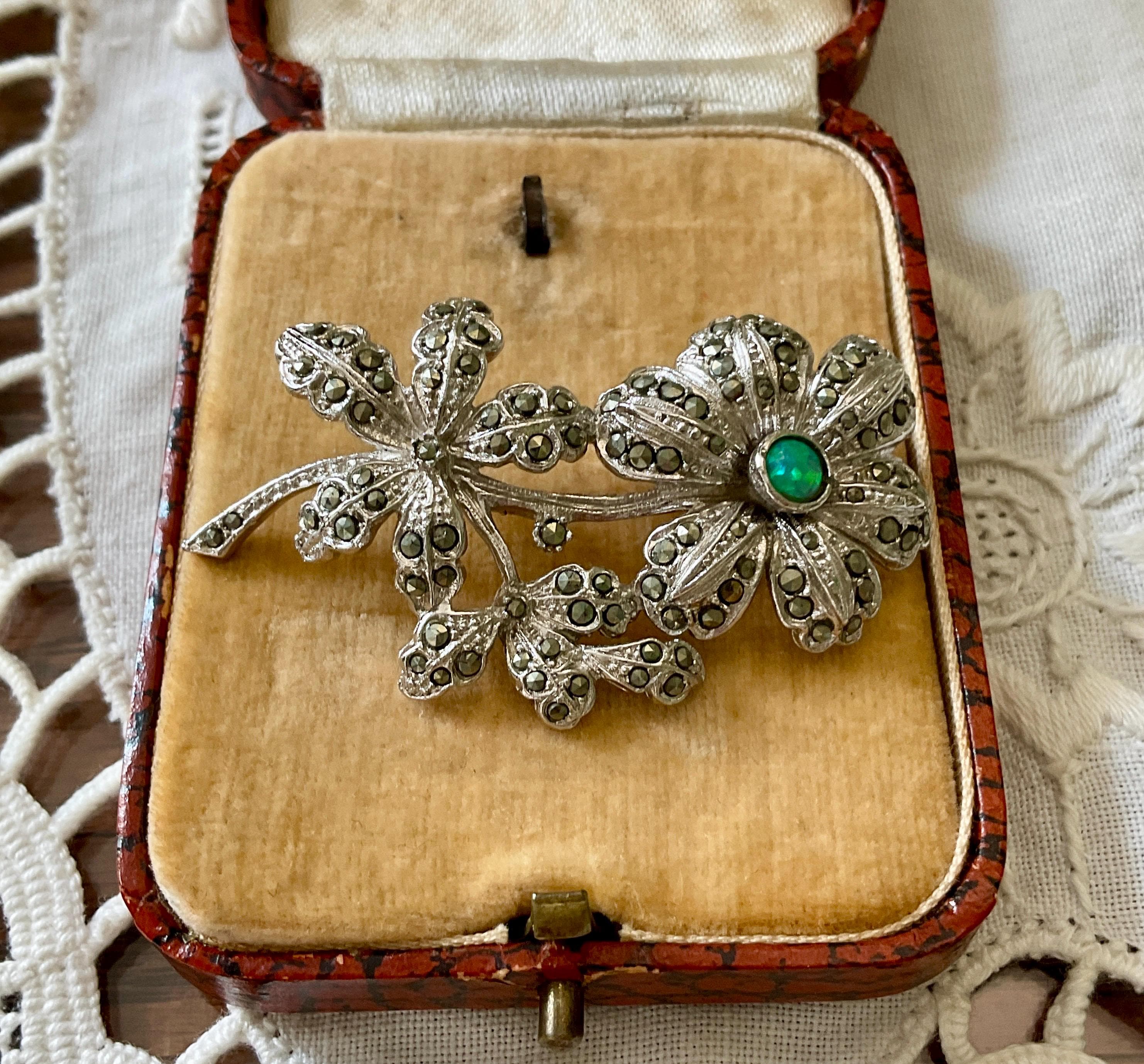 Add timeless elegance to your look with this stunning vintage sterling silver marcasite flower brooc...