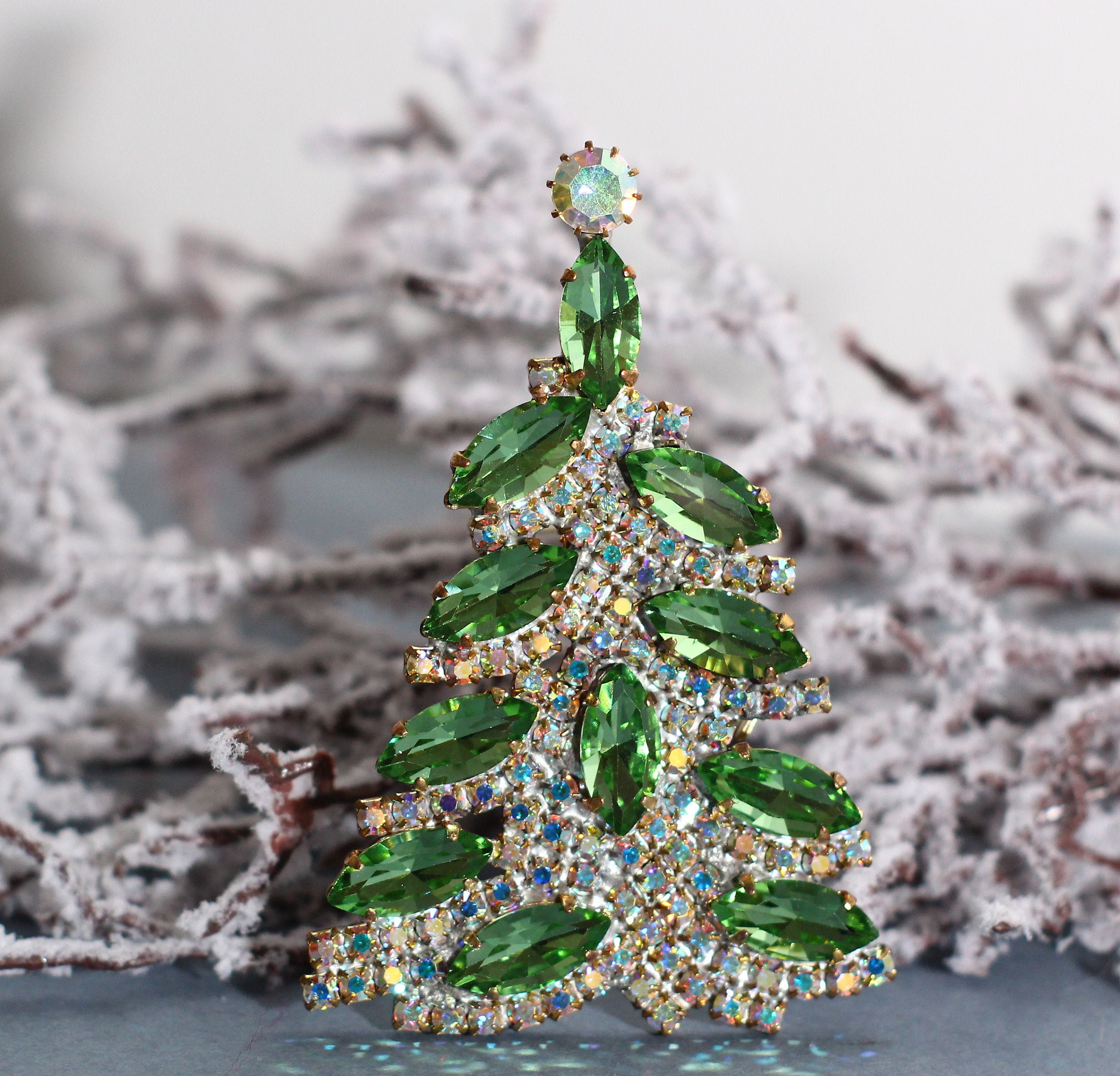 Vintage Christmas Tree Pin, Czech Crystal Christmas Brooch, Vintage...