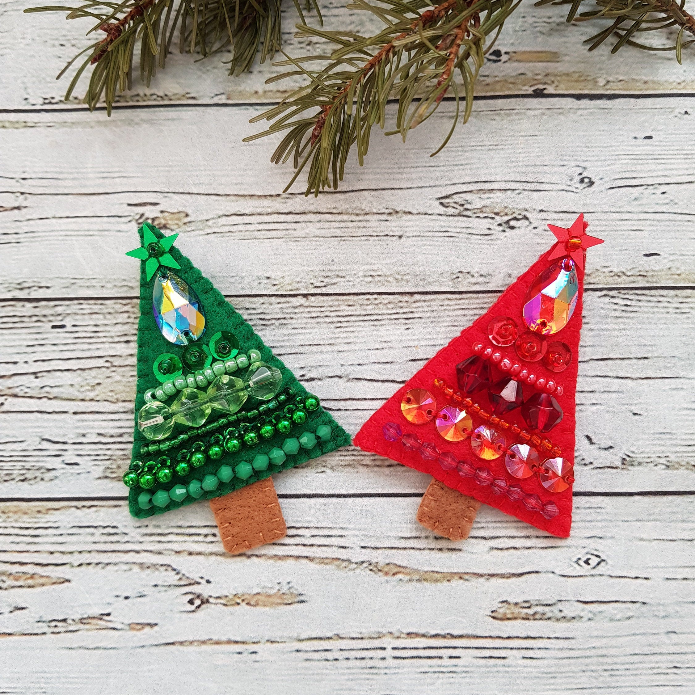 Christmas tree brooches, one green and one red. I used felt, beads, sequins, embellishments, thread ...