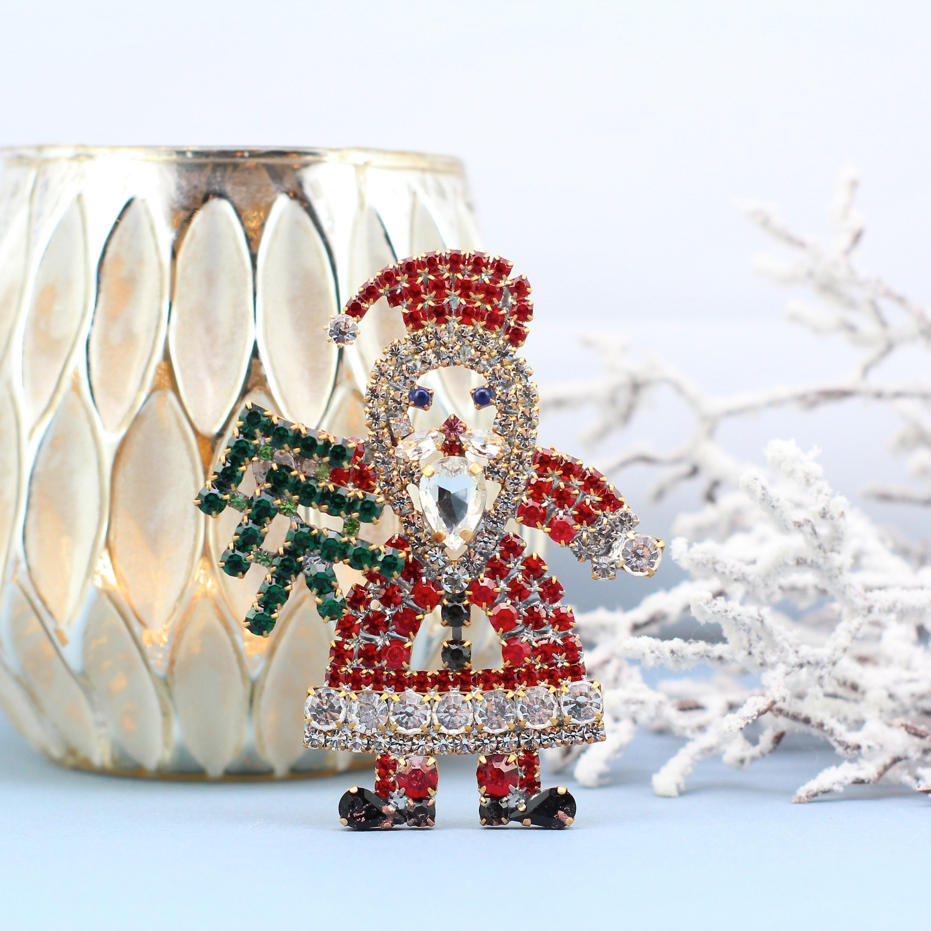 "Vintage rhinestone christmas Santa with tree pin, christmas brooch Santa Dimensions: Tall: 3.5...