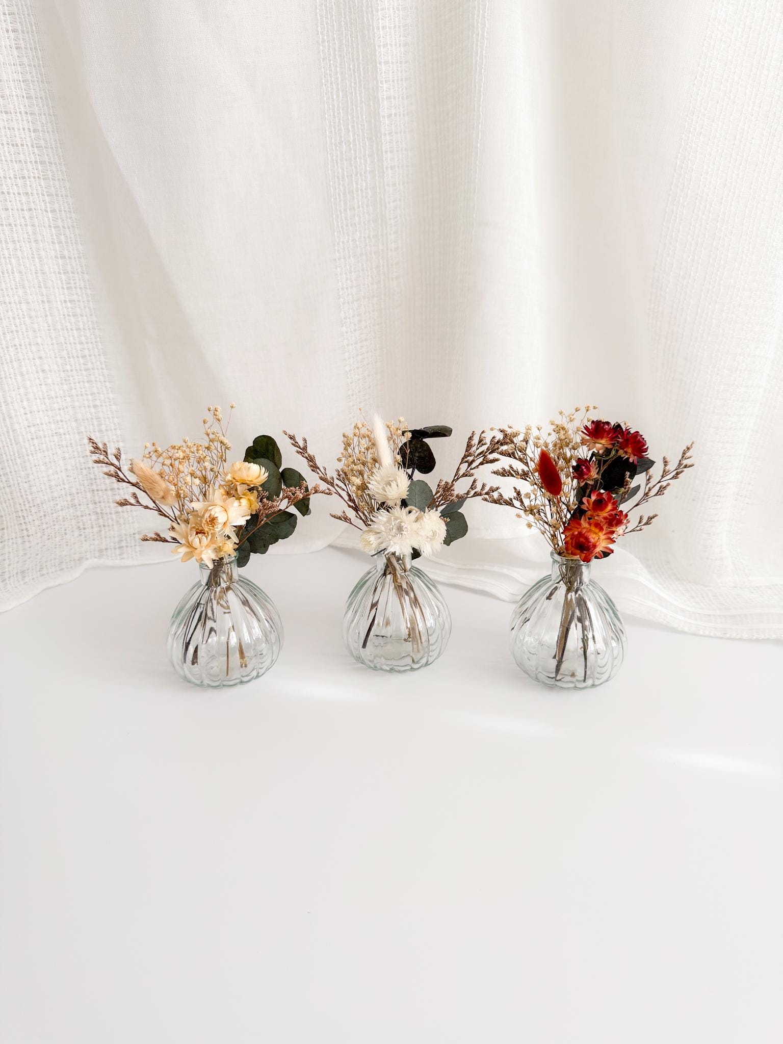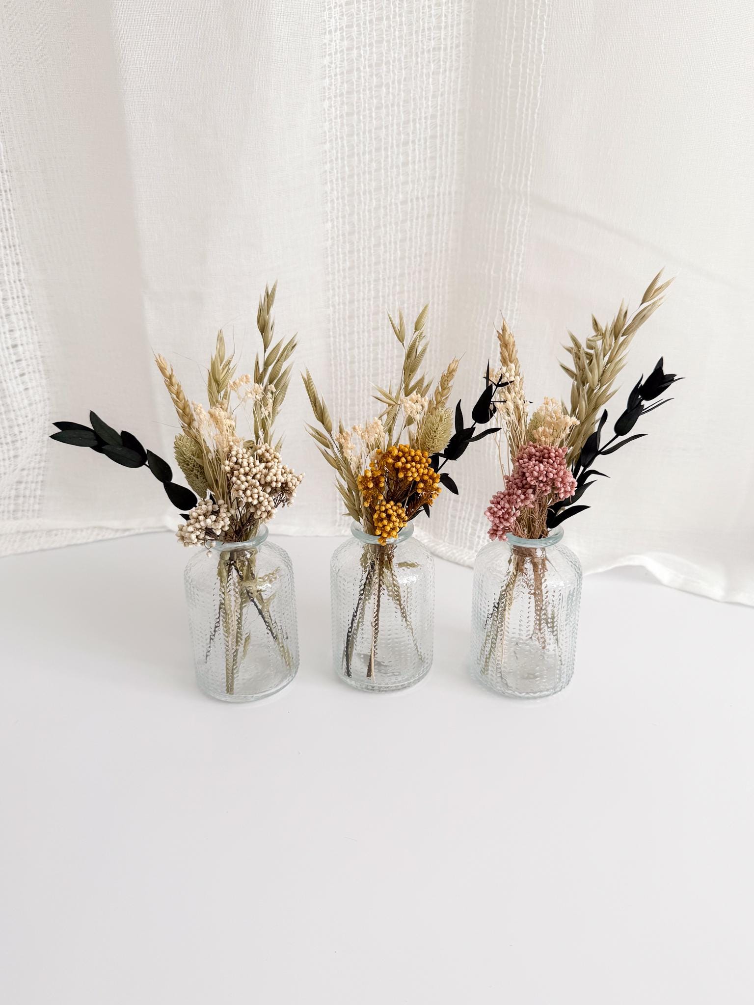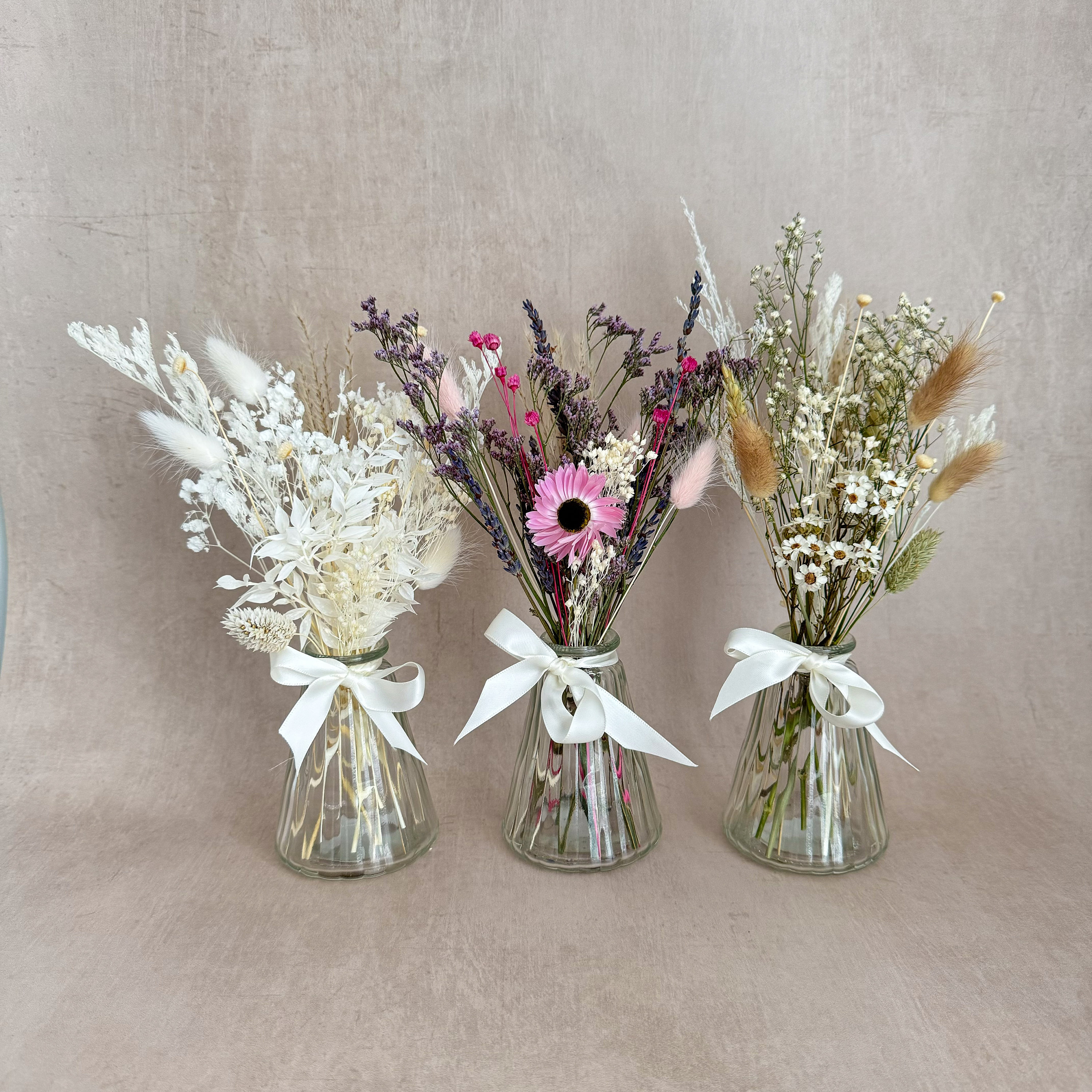 3 different mini dried flower posies, beautifully arranged in an optional glass vases. Each bouquet ...
