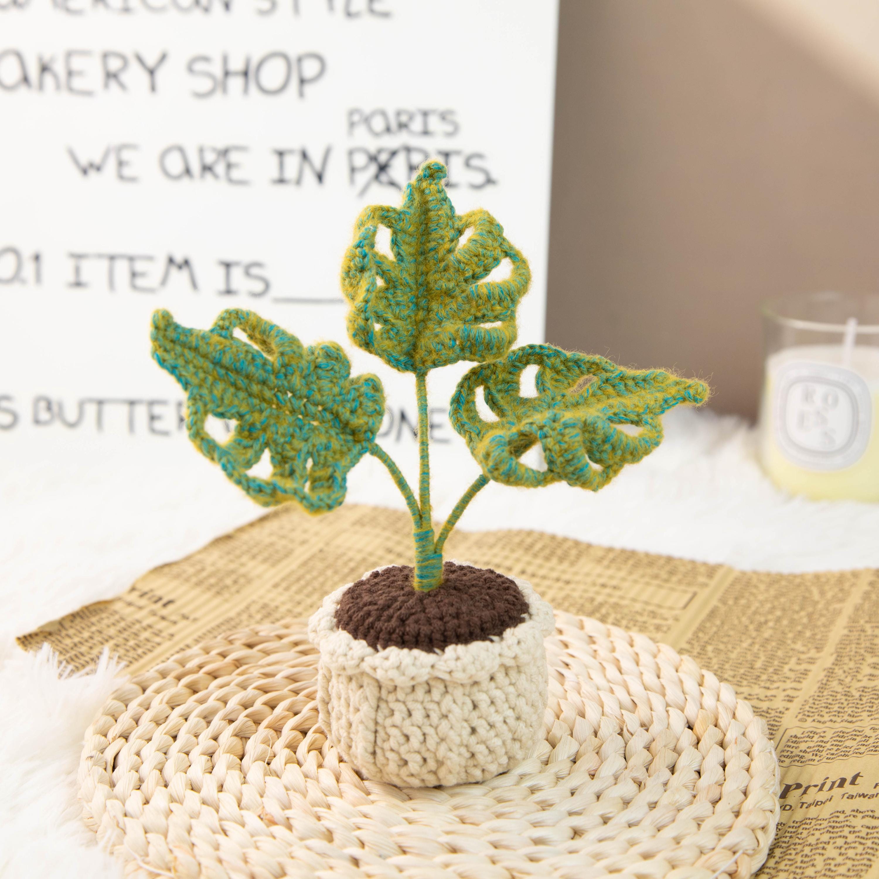 Crochet Monstera Plant Decor - Handmade Knitted Potted Leaf, Cozy Green Yarn Houseplant for Home or ...