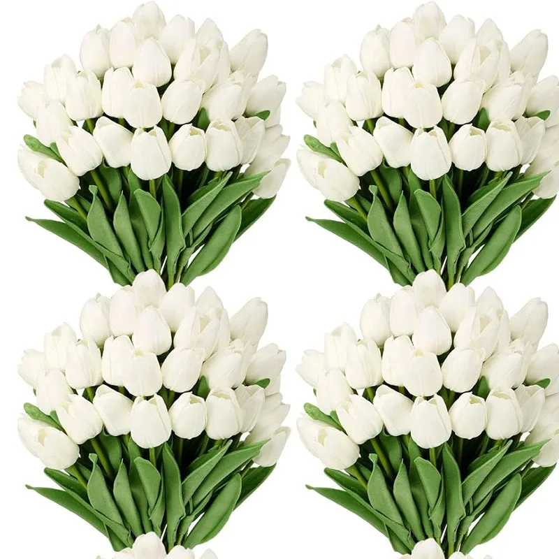 100 Pcs White Artificial Tulips PU Faux Tulips Bouquet Flower for W...