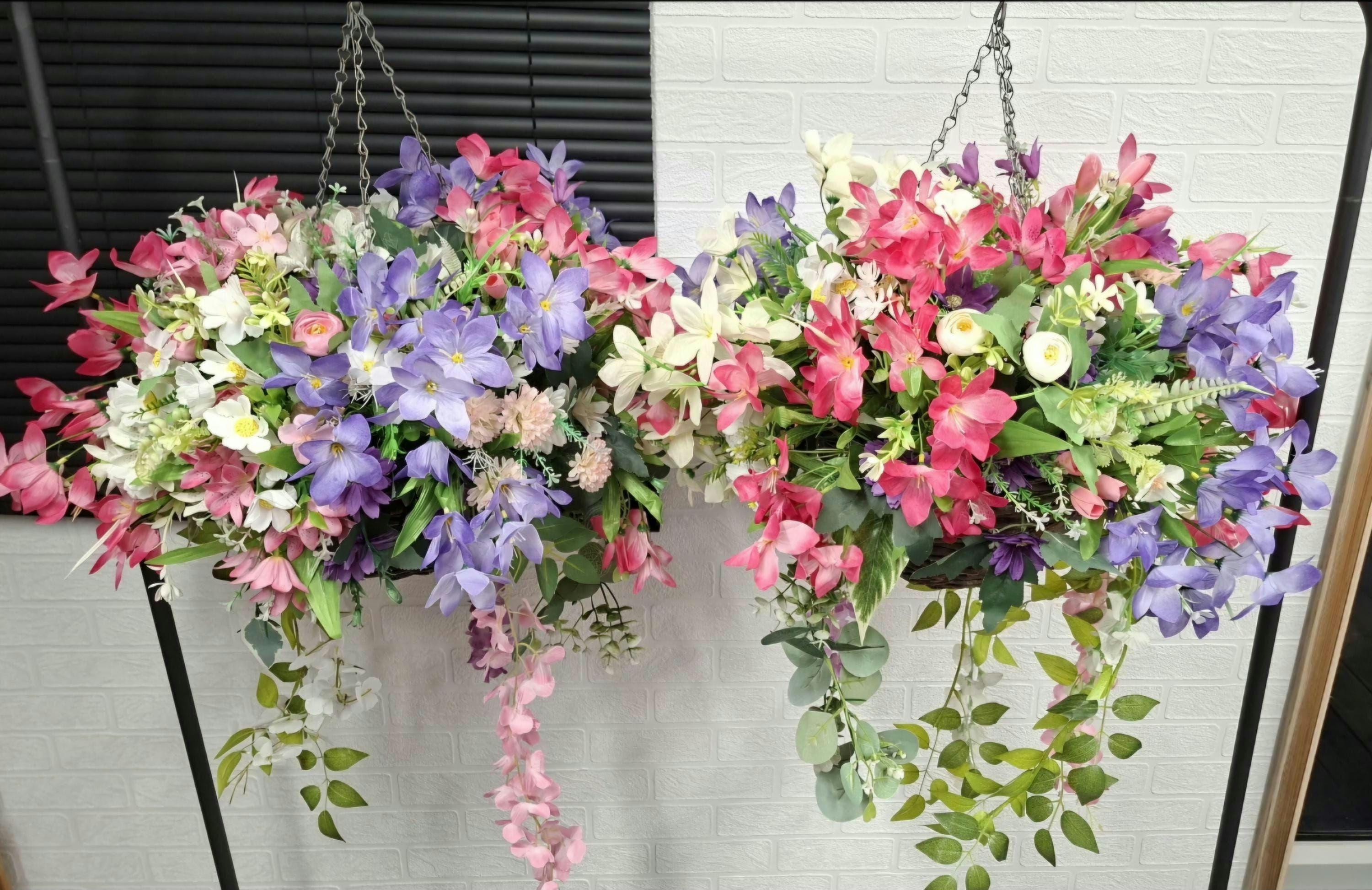 "large super bright and colourful artificial hanging baskets, made in 12\" baskets and aro...