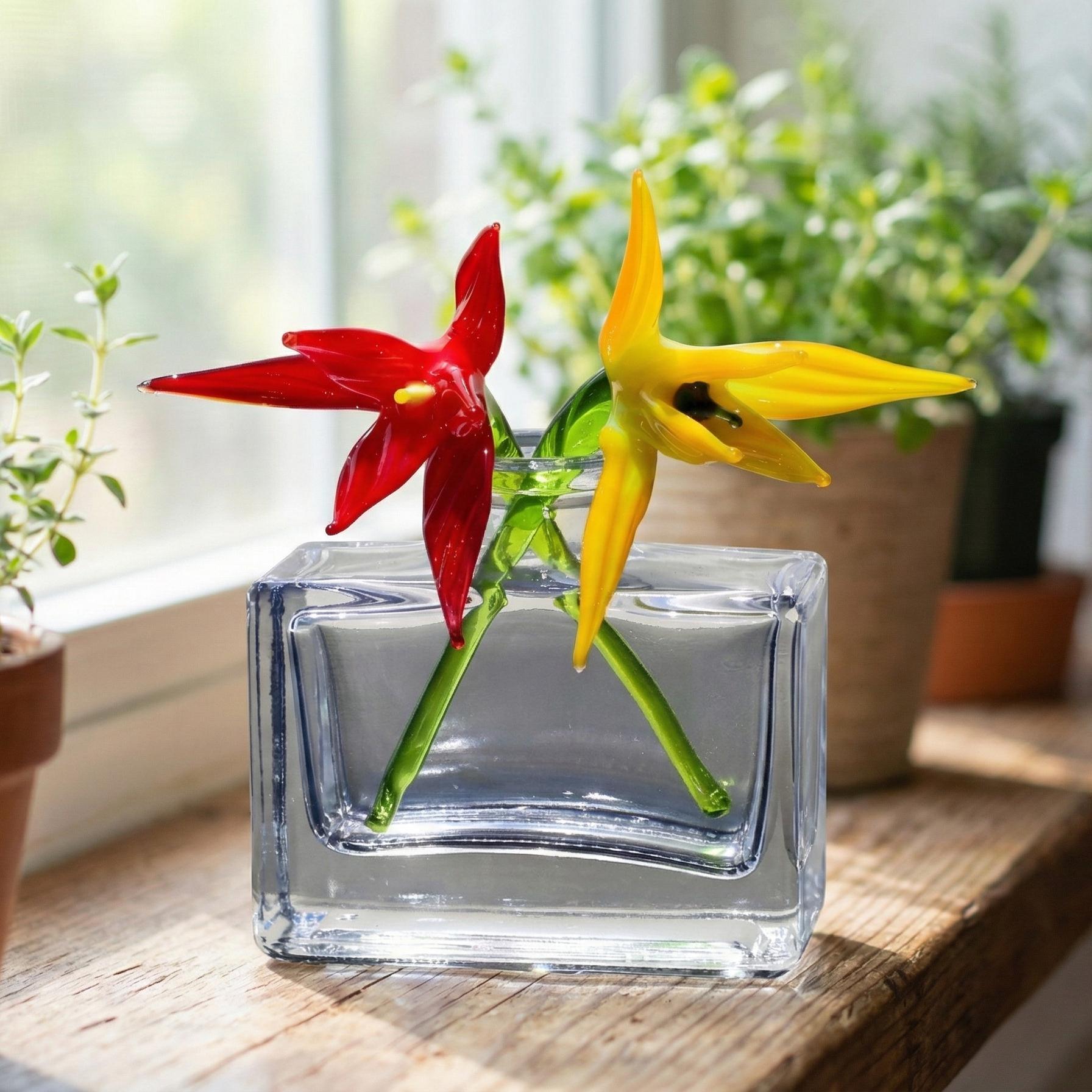 "This handcrafted Glass Flower Set features a fiery Red and a brilliant Yellow Bird of Paradise...