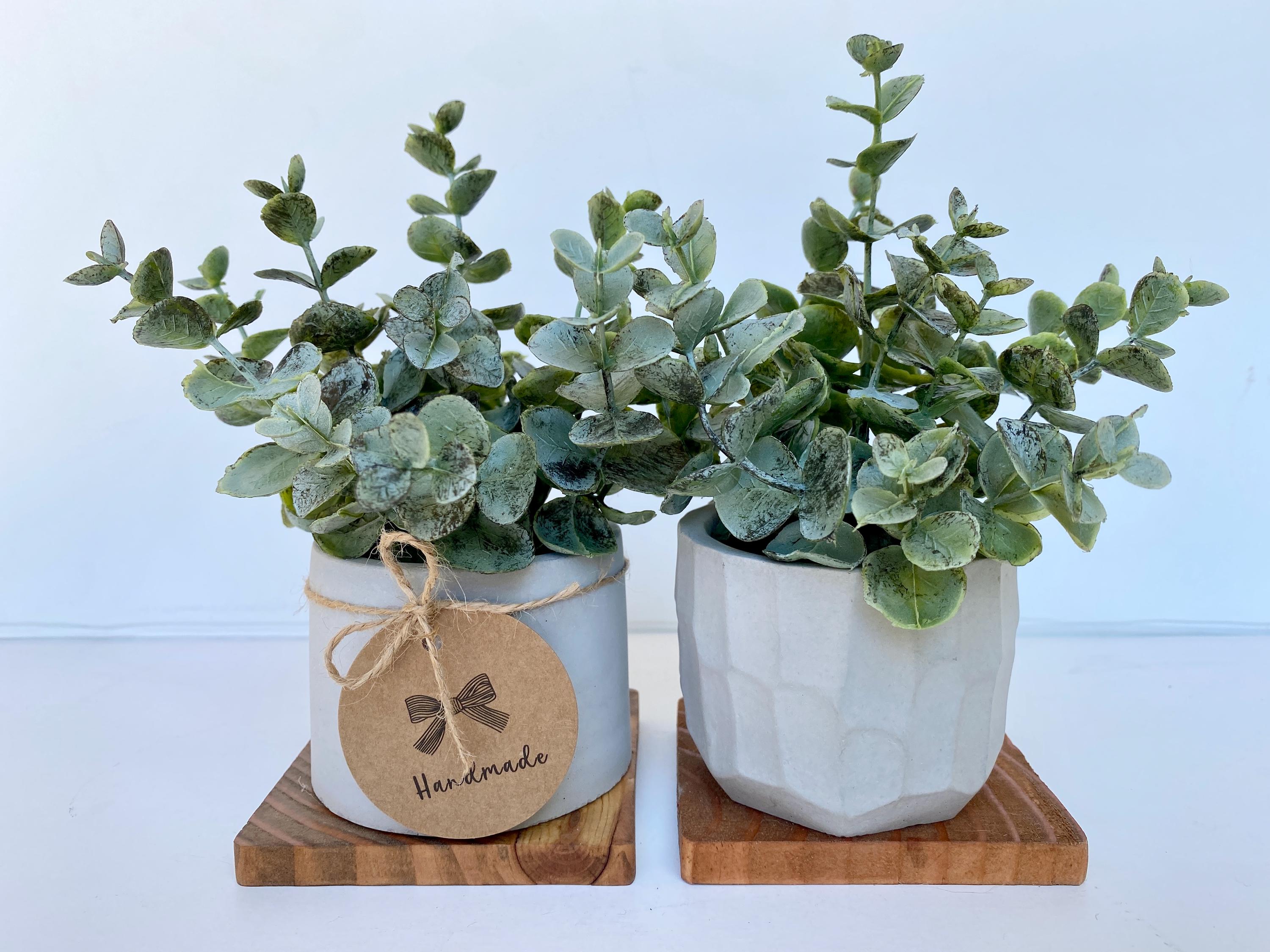 Artificial Eucalyptus Plant in handmade Concrete Pot with Wood Tray...