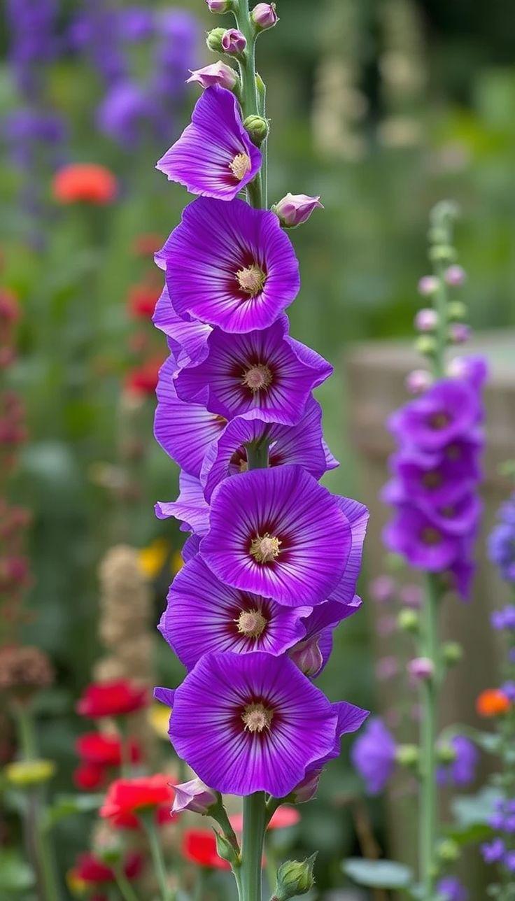 Grow elegant double dark purple hollyhock flowers and add classic charm to your garden. Hollyhocks a...
