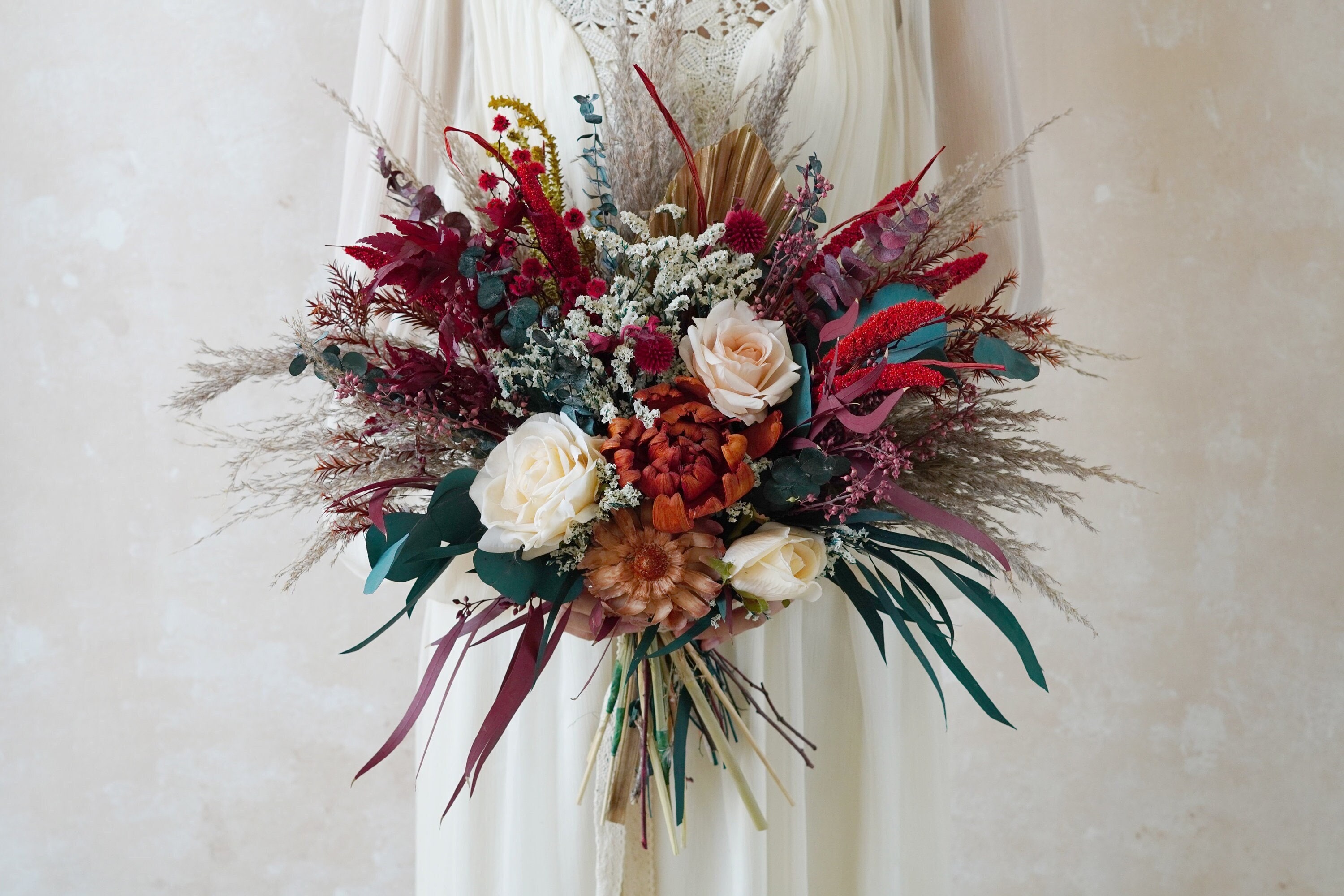 Rust Orange~Green Eucalyptus Leaves Bouquet/Deep Red Bouquet/Pampas Grass Bouquet/Bride & Brides...