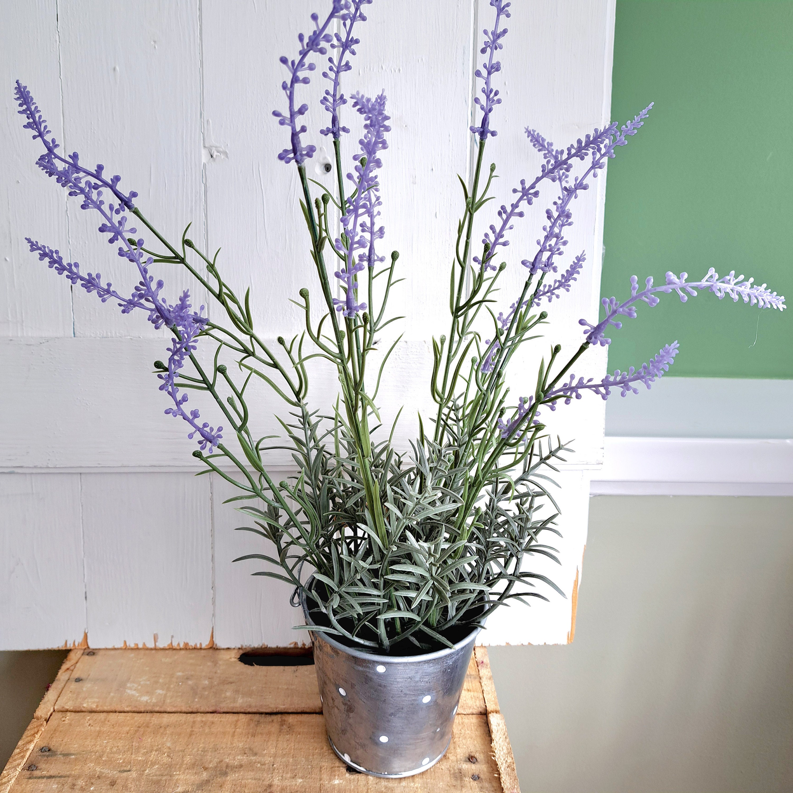 Faux lavender plant with light coloured flowers and grey green foliage, potted in a black plastic po...