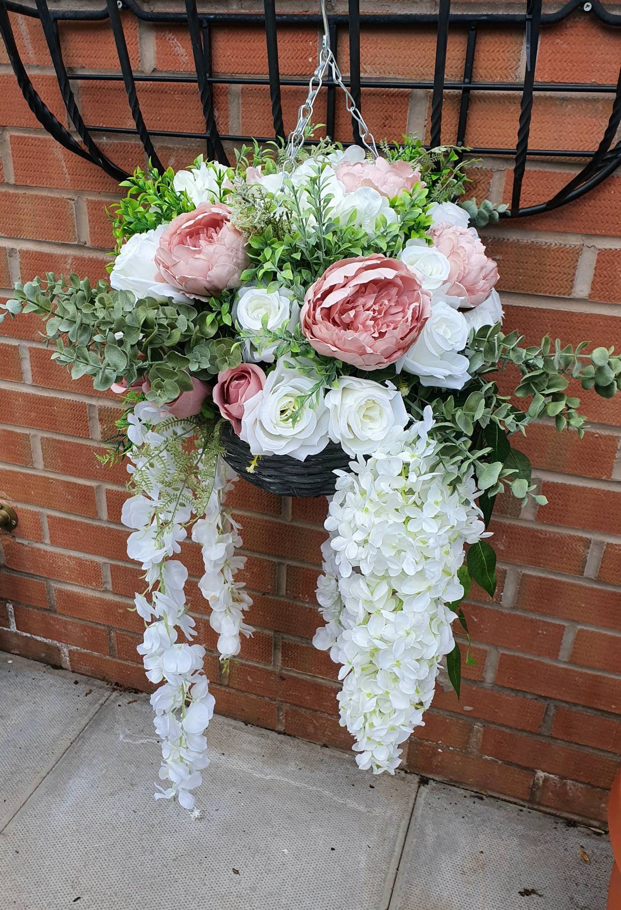 This beautiful hanging basket has been made with artificial flowers - roses, hydrangeas and peonys. ...