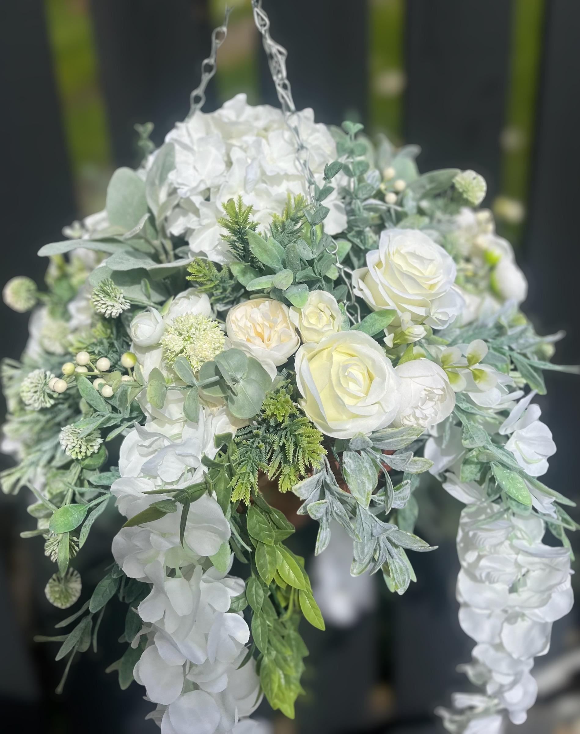 "all white winter artificial hanging basket. This vibrant and lifelike arrangement is perfect f...