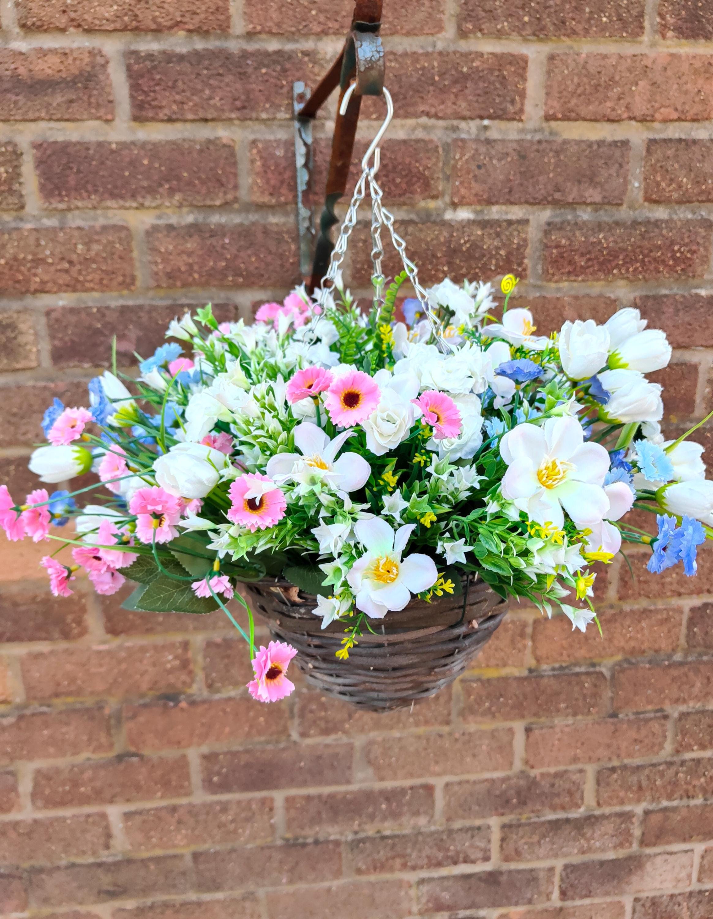 Pink White and Blue Artificial Flower Hanging Basket. Handcrafted with Love. Features Artificial flo...