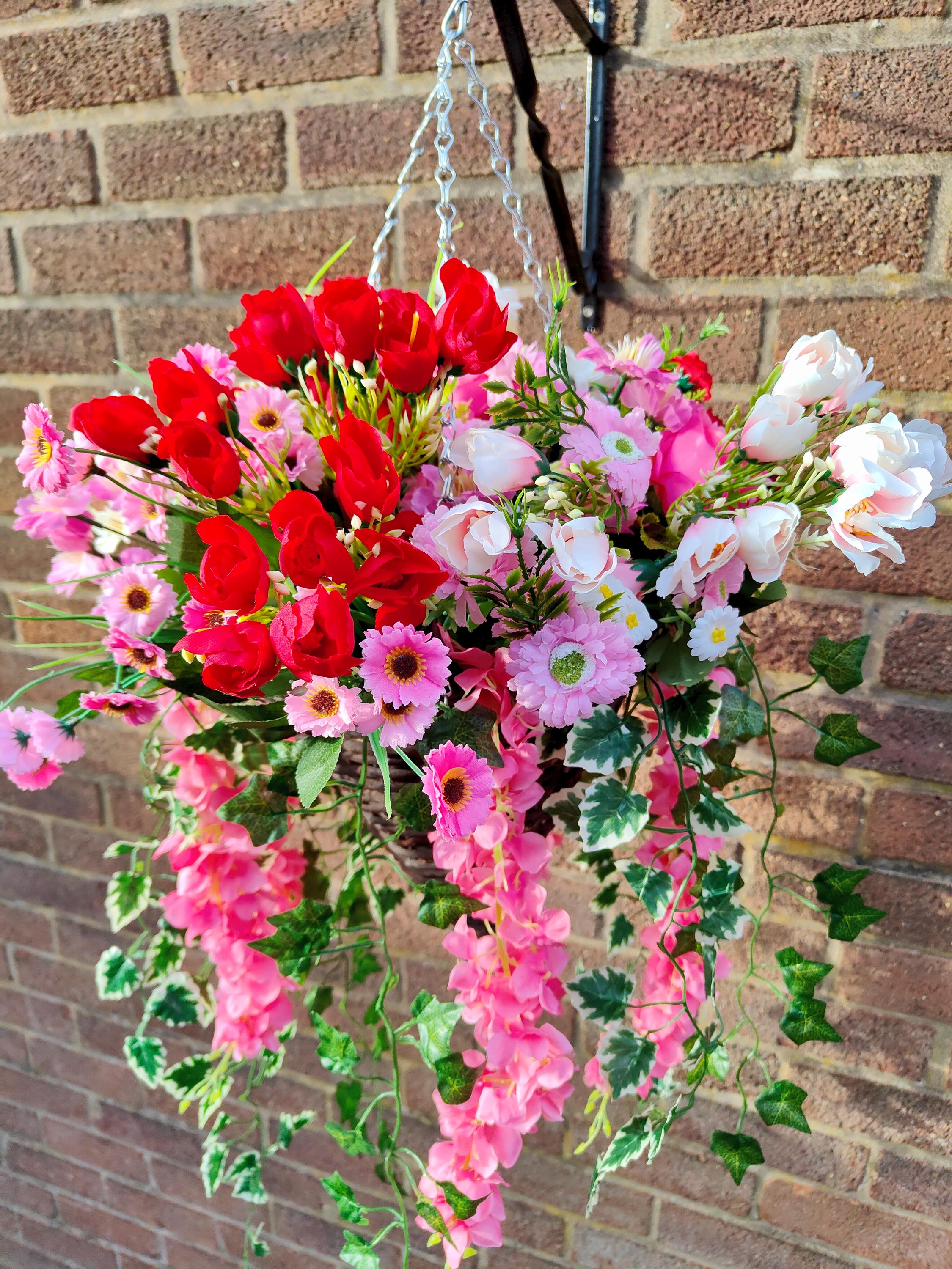Deluxe Pink , Red and White Artificial Flower Hanging Basket. Handcrafted with Love. Features Red Wh...