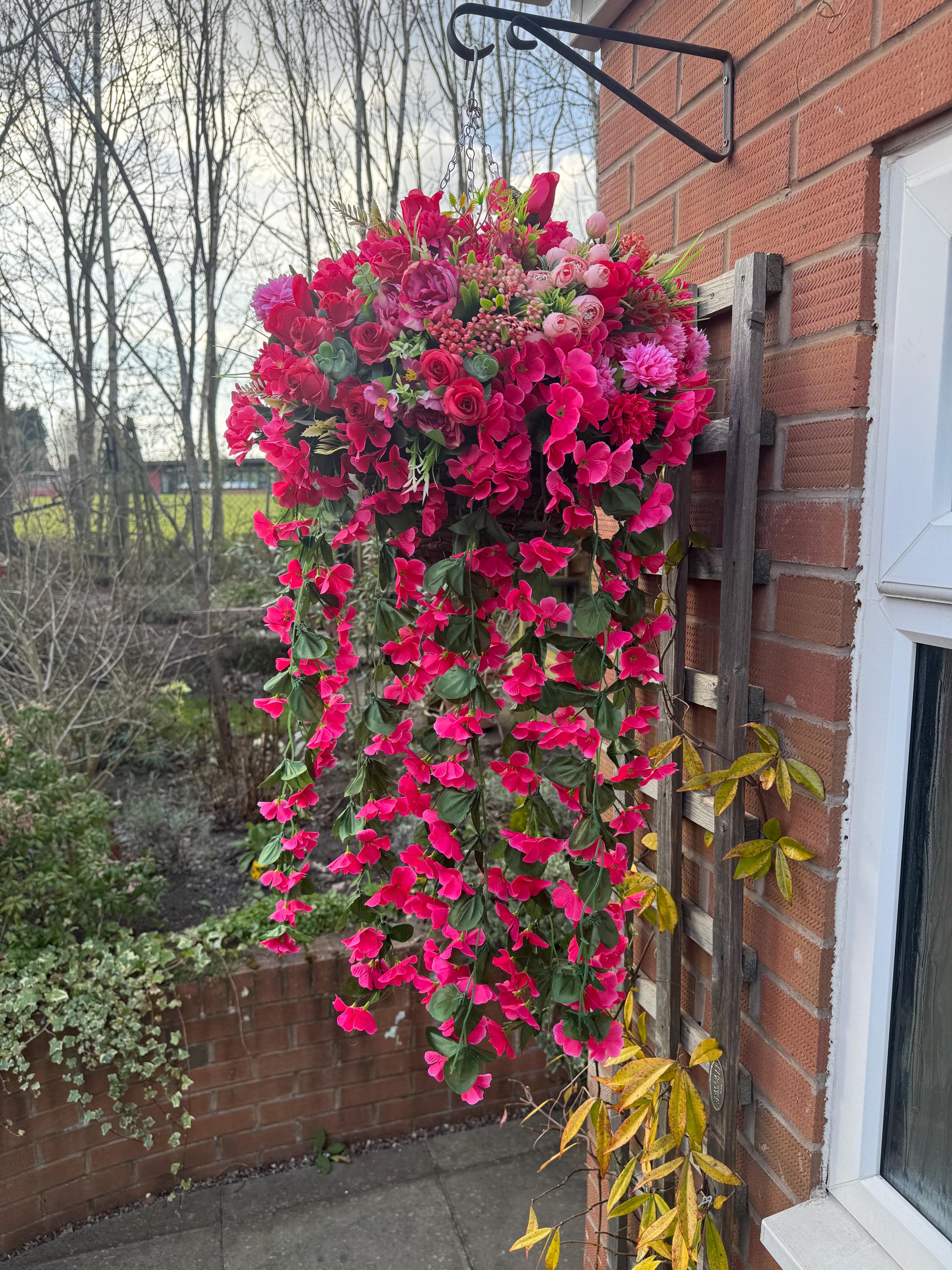 Artificial Luxury Hanging Basket - Cerise, Pink and Red - brown han...