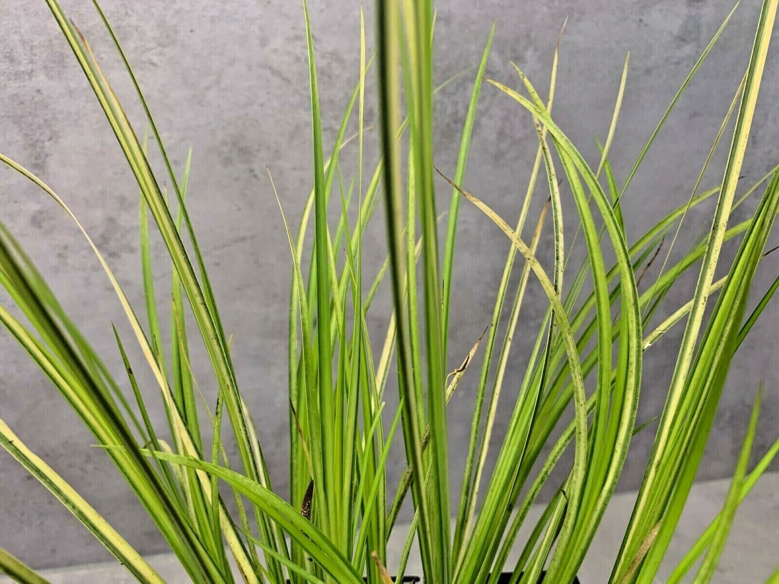 Slender erect foliage, vividly striped green and white vertically. Plant in medium container using a...