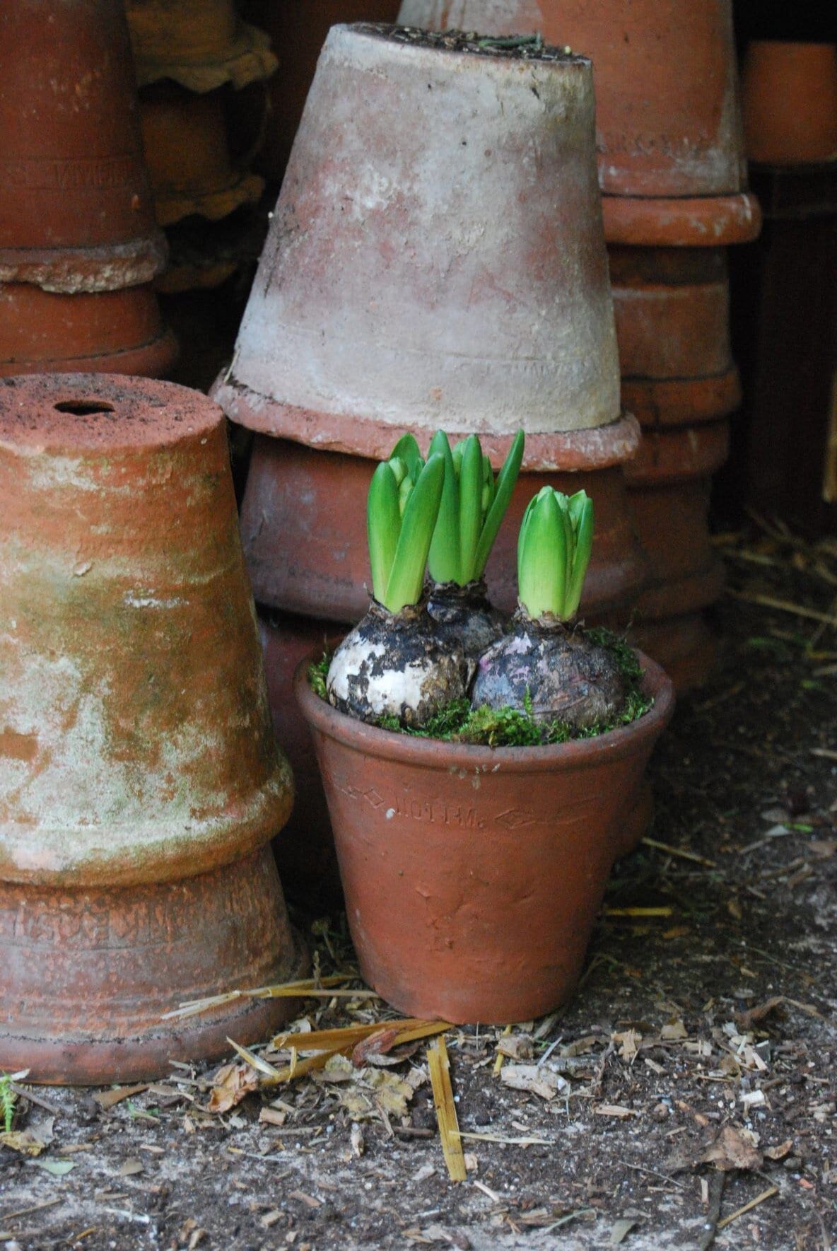 Vintage Sankey terracotta pot planted with hyacinth bulbs and natur...