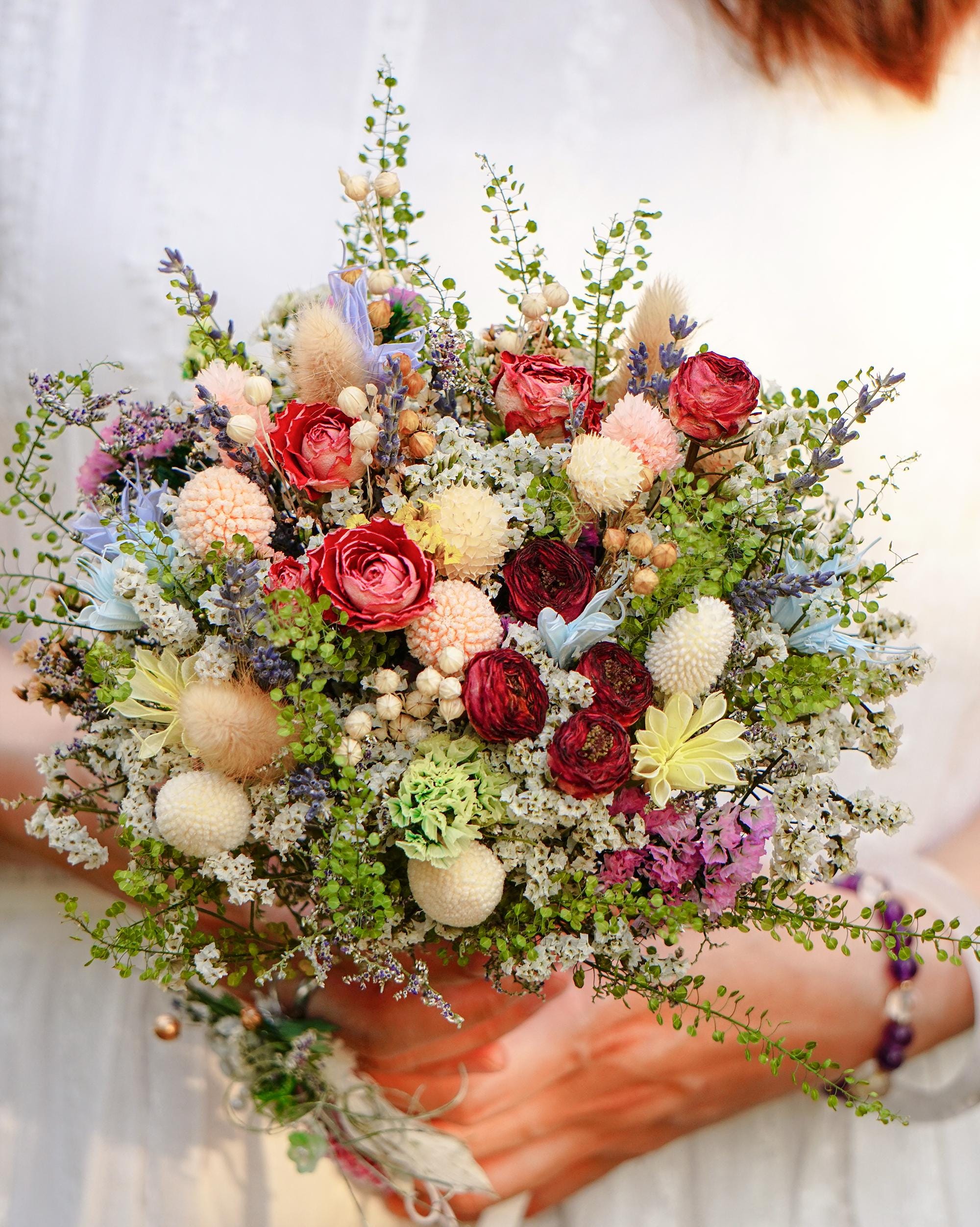 Colorful rose forget-me-not dried flower bouquet, red romantic brid...