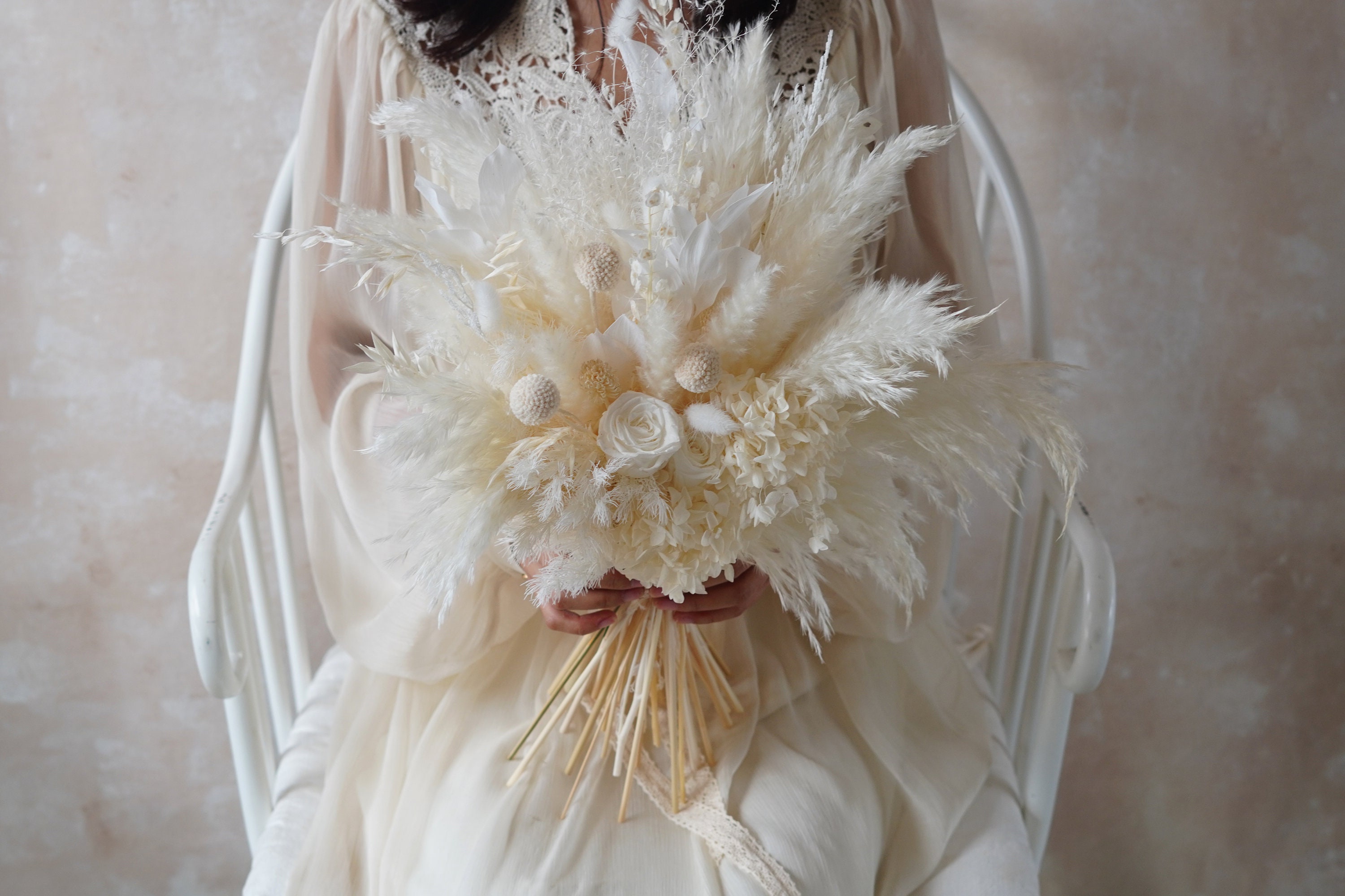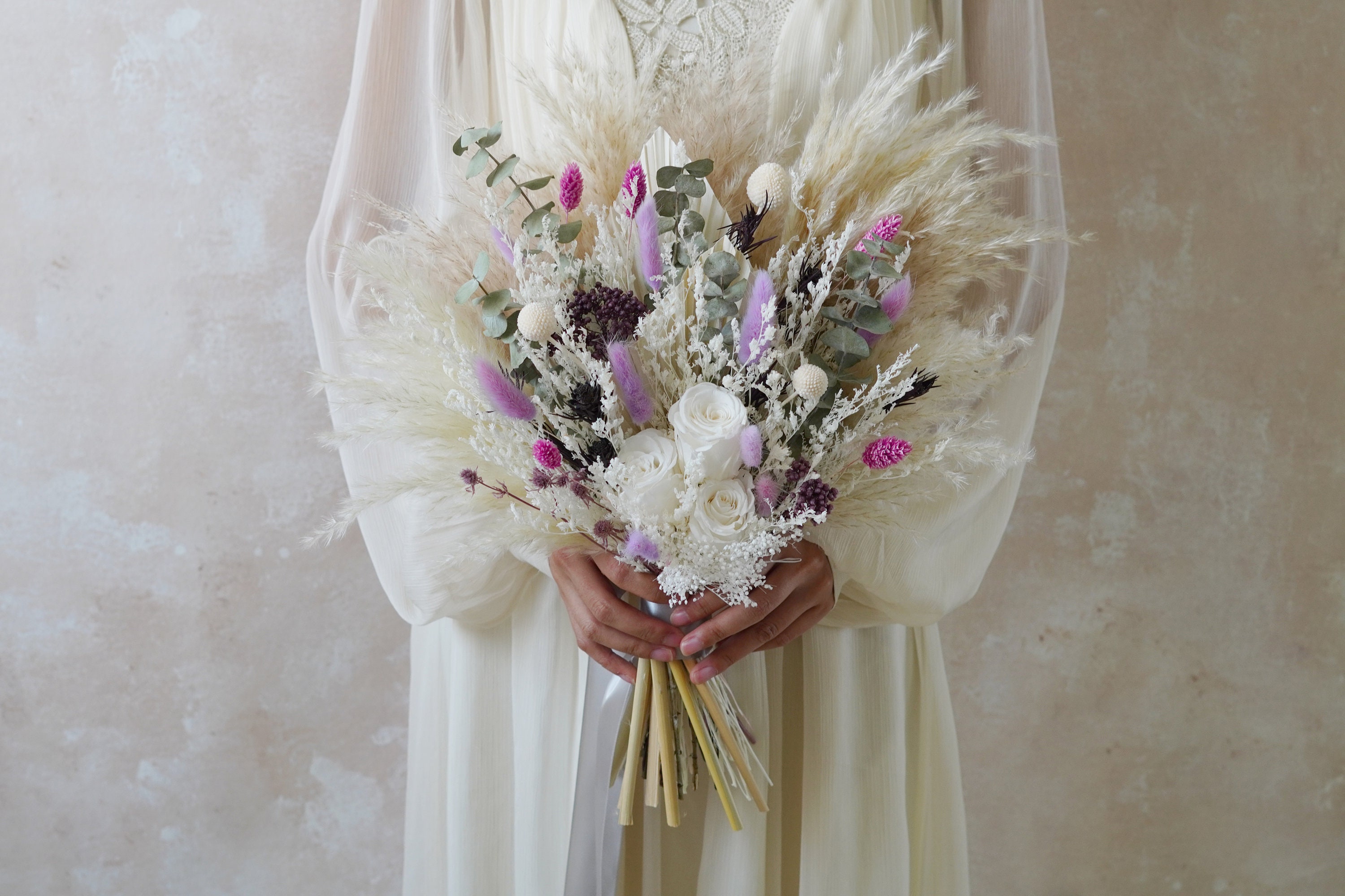 Eucalyptus&White Rose Wedding Bouquet,Purple Bridal Bouquet,Pampas Grass Bouquet,Boho Wedding Bo...