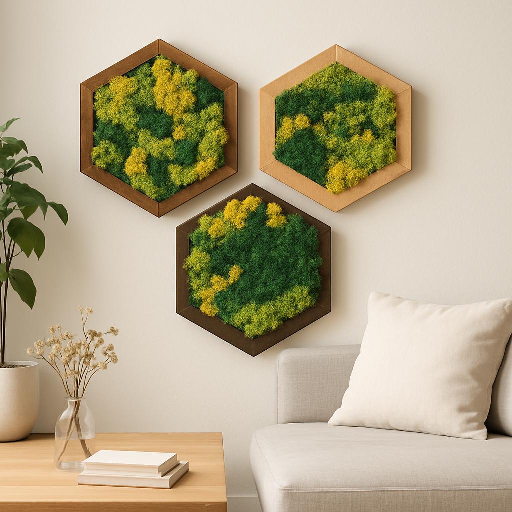 Bring a touch of nature into your home with this handmade set of 3 hexagon moss panels. Each piece i...