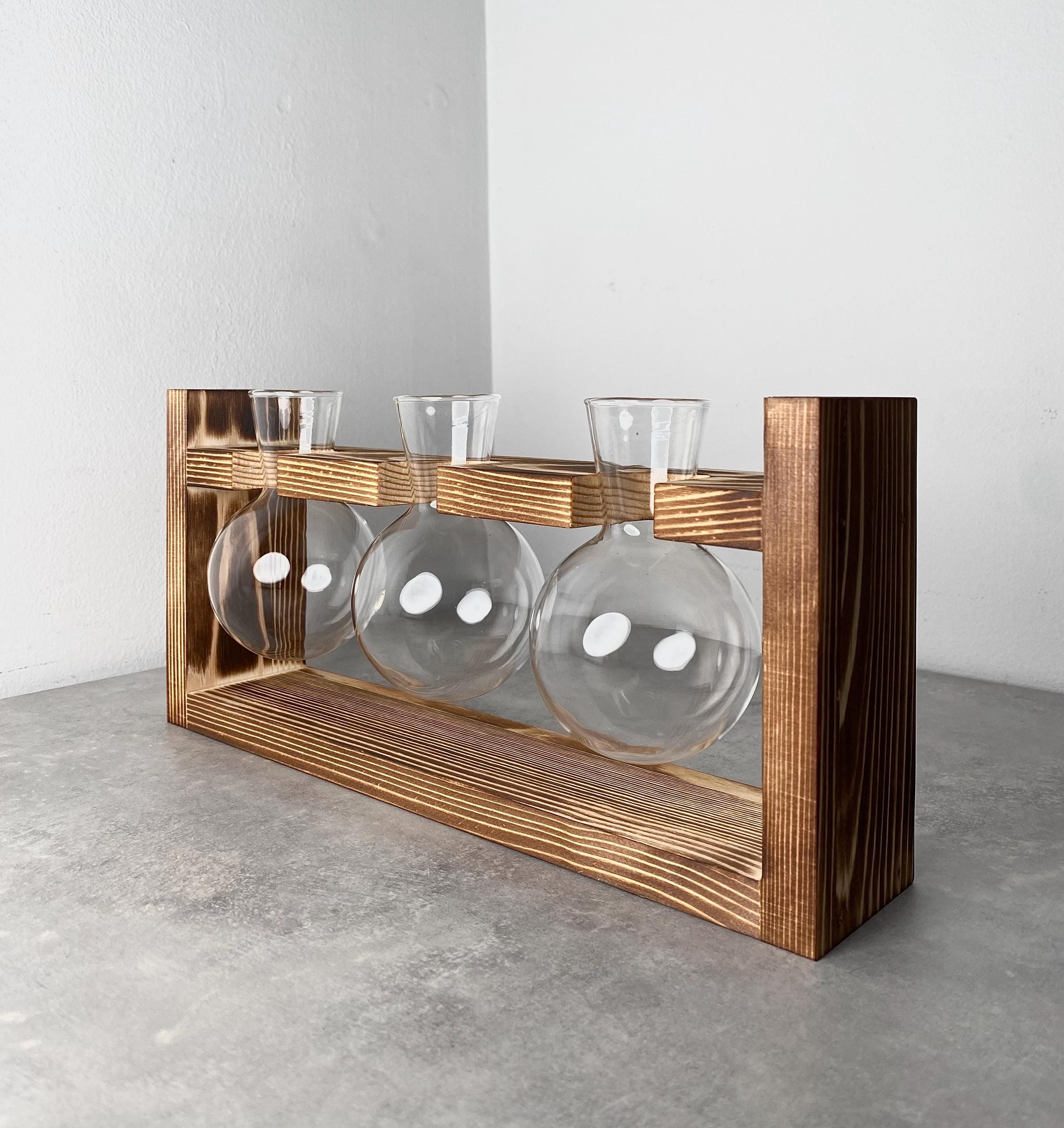 Minimalist hydroponic wooden desk planter with 3x mini bulb shaped vases constructed from high stren...