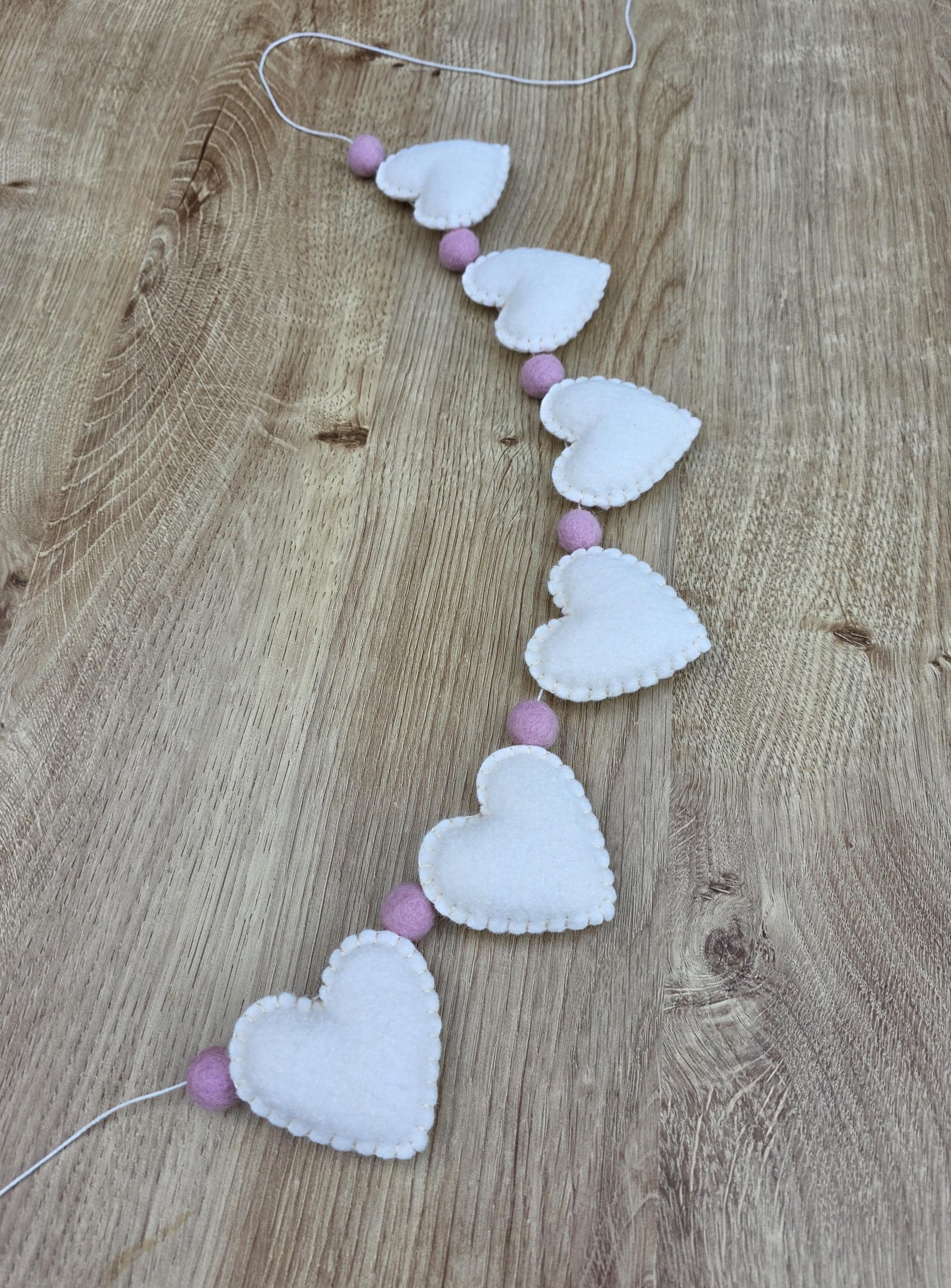 This pretty garland is made from cream woolfelt and cute pink felt pom pom balls. Each heart measure...