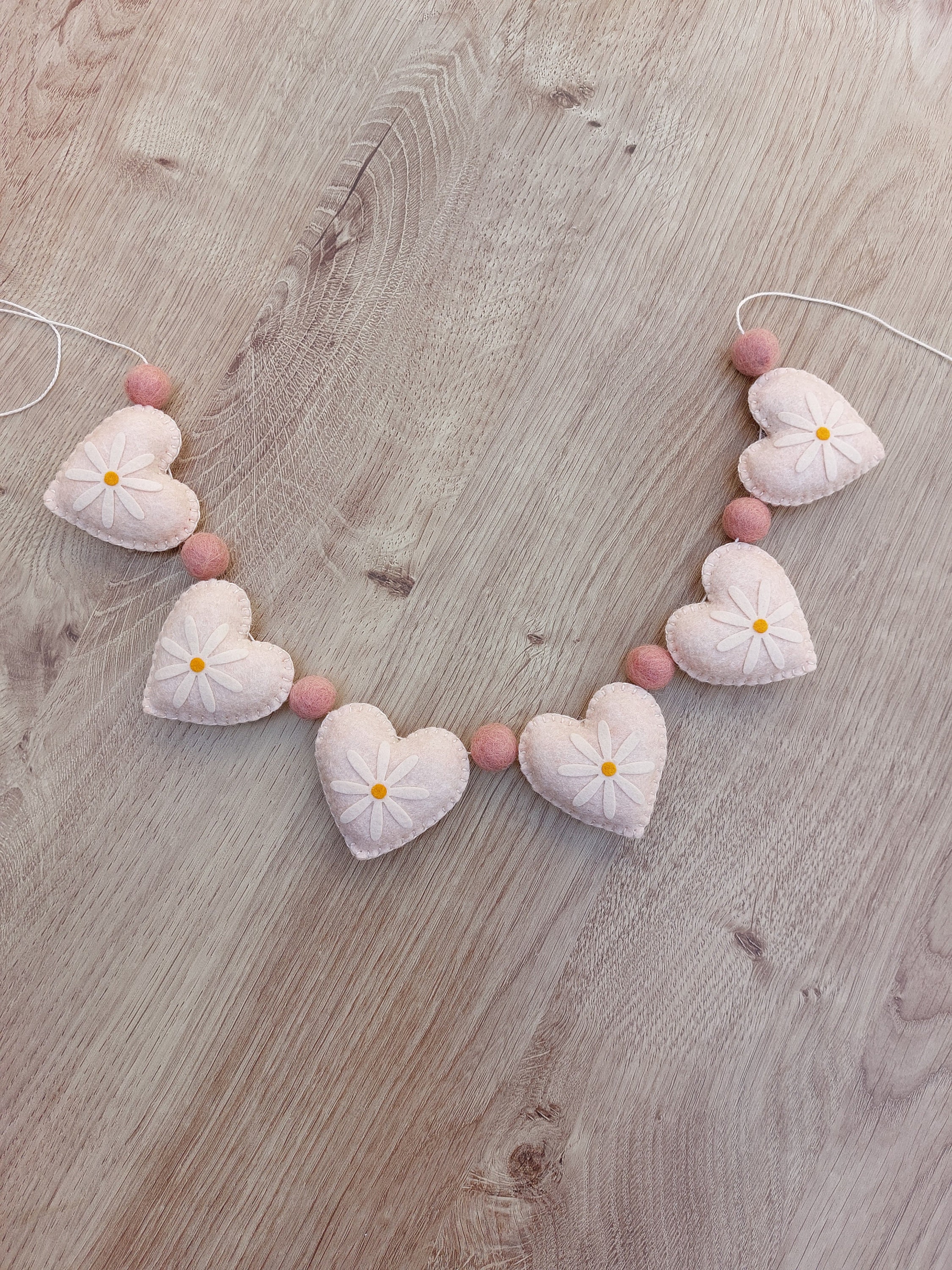 A pretty daisy heart garland made from peach woolfelt and blush felt pom pom balls. Each heart measu...