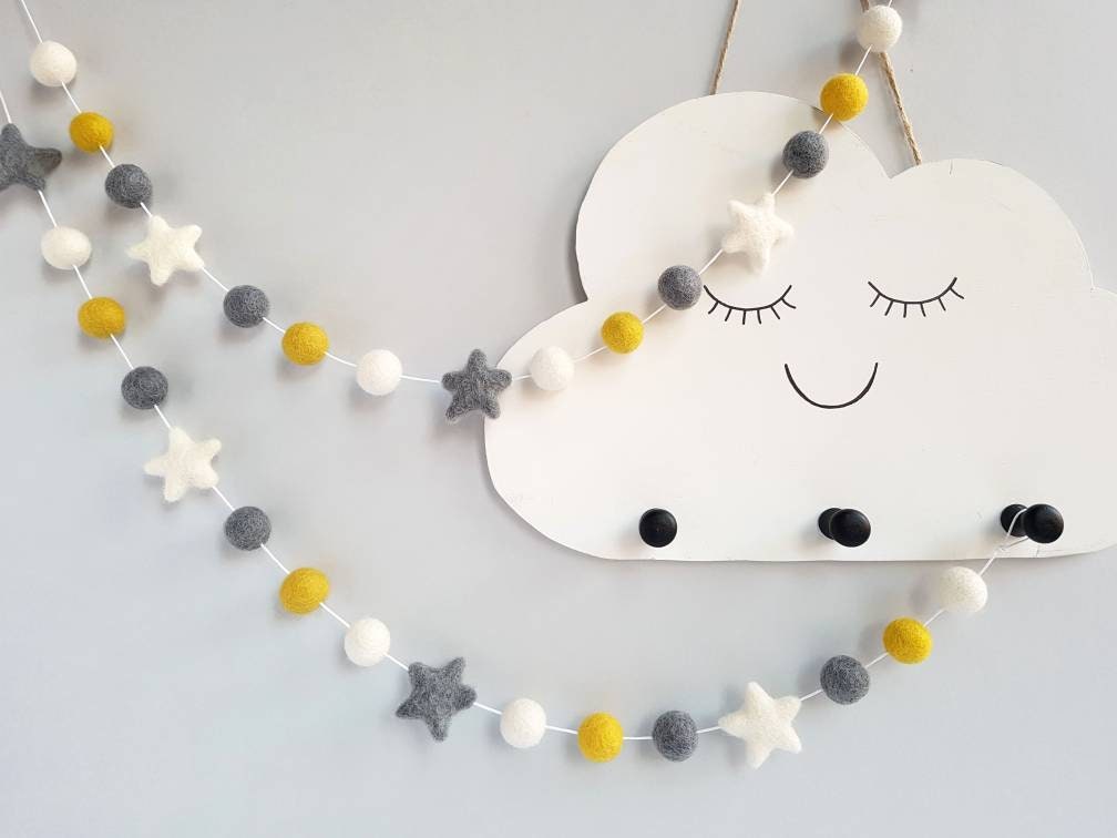 This mustard yellow and charcoal grey felt wool pom pom and star garland is the perfect decoration f...
