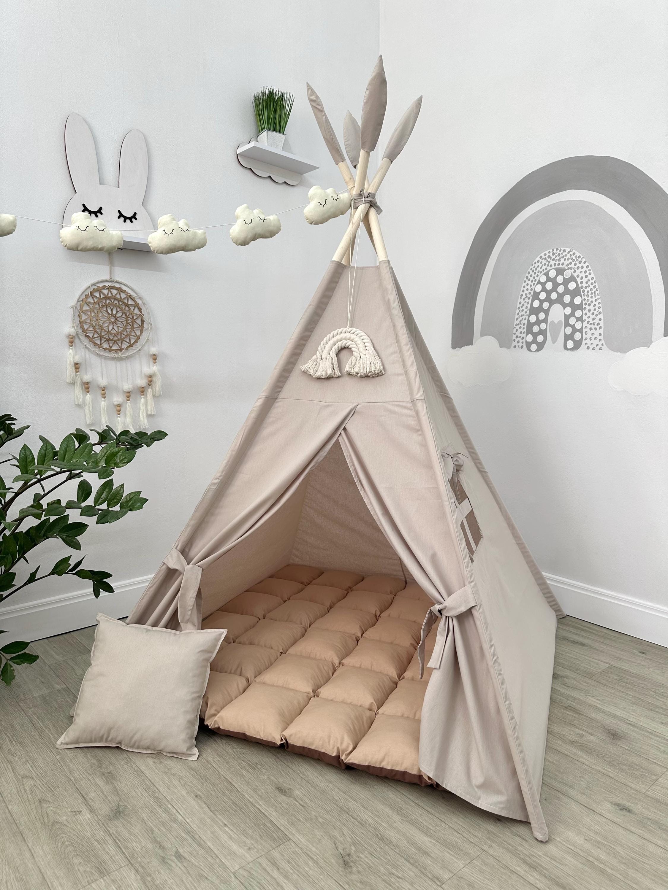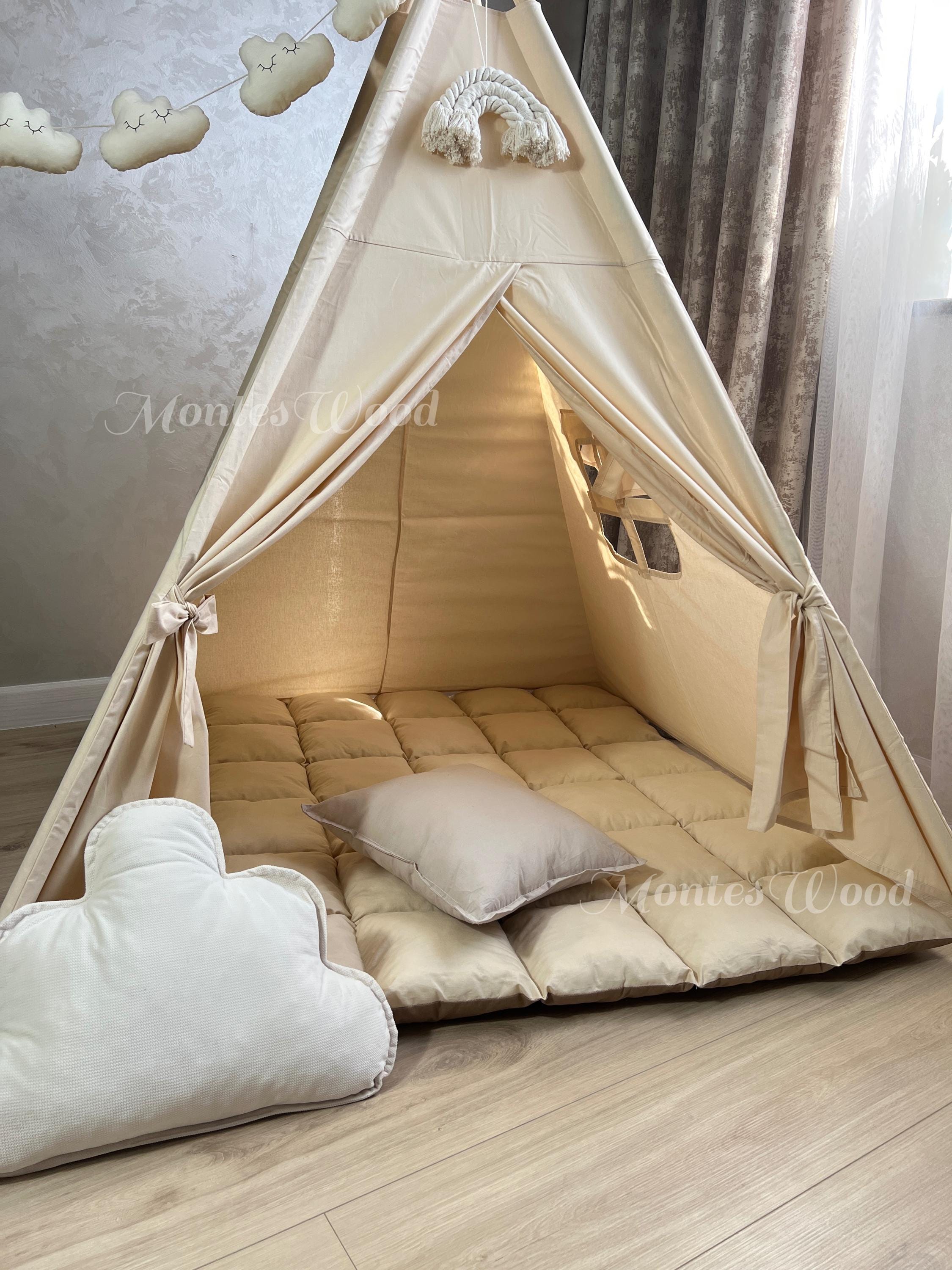 This handmade kids teepee tent with mat is a cozy playhouse for boys and girls. Crafted in neutral b...