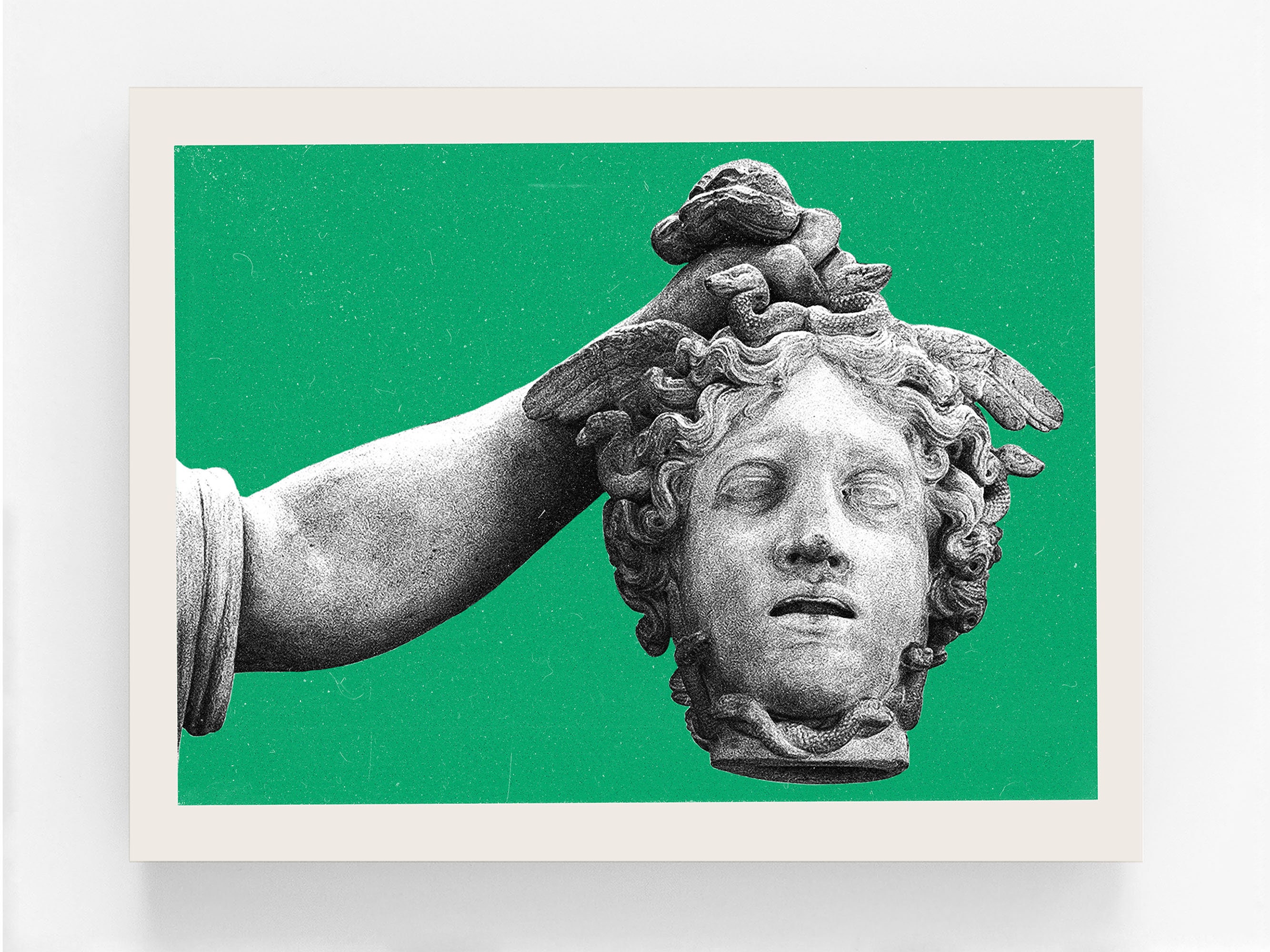 "A black and white cutout of the head of Medusa, slain by Perseus. The object displays against ...