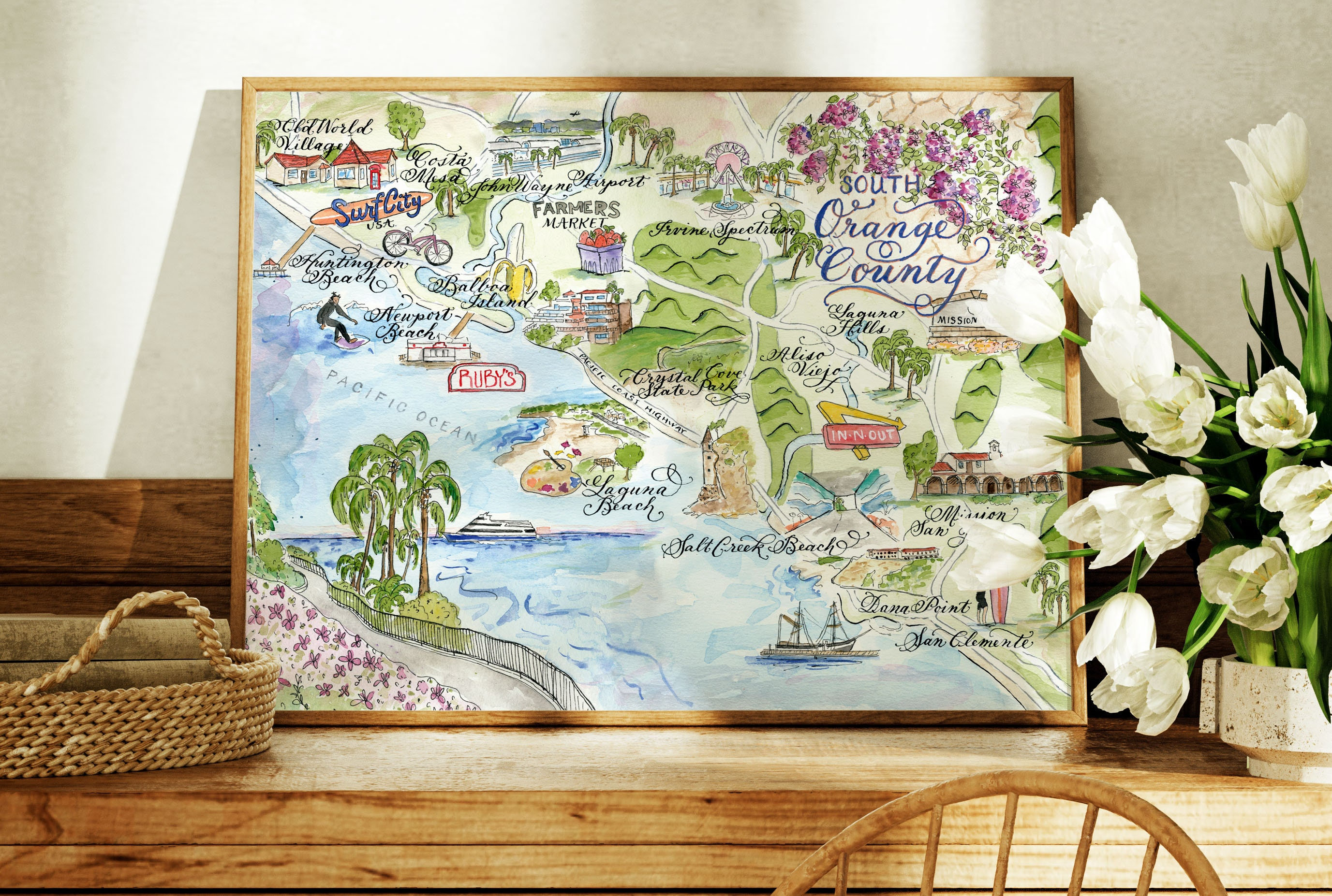 Map of South Orange County, California, Hand-painted Watercolor, Lu...