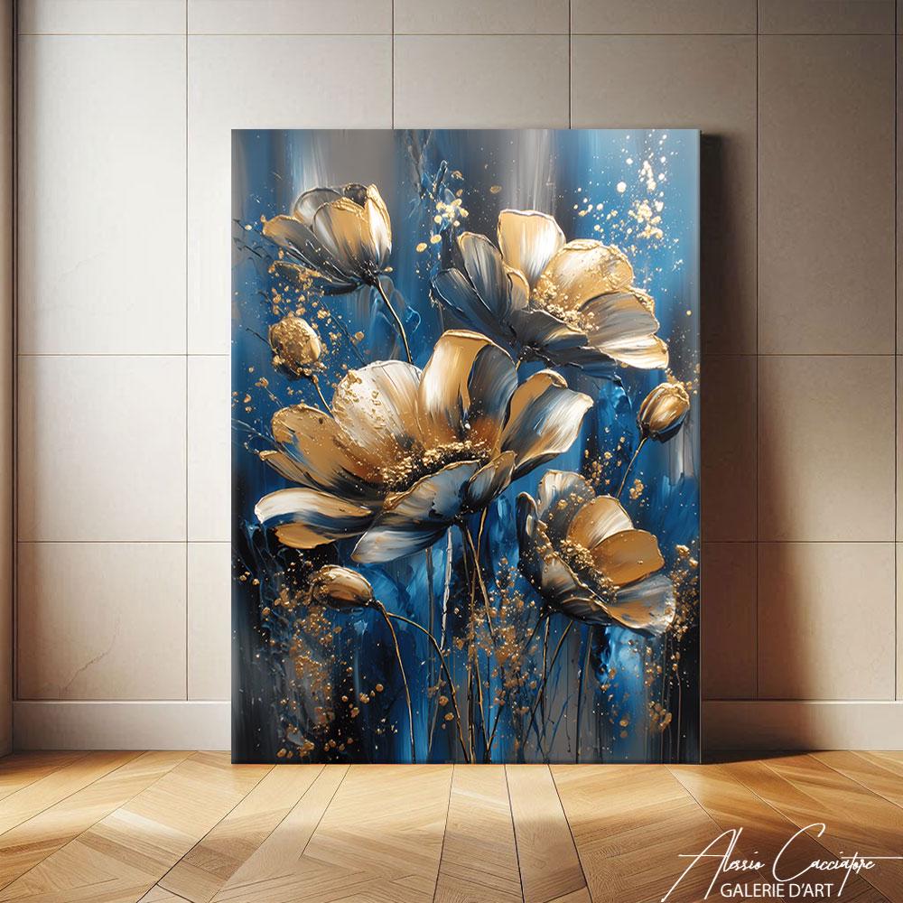 Blue Gold Wall Art Framed, Abstract Flower Art Prints, Large Navy B...