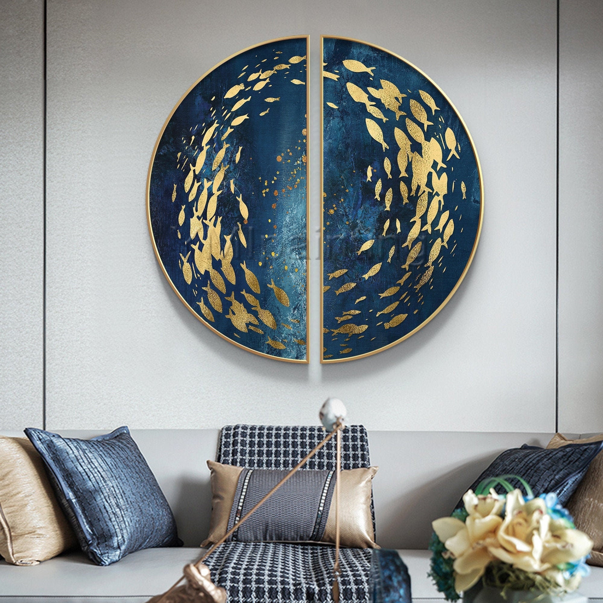 School of Fish Painting,Circular wall art,Set of 2,Ocean Wall art,R...