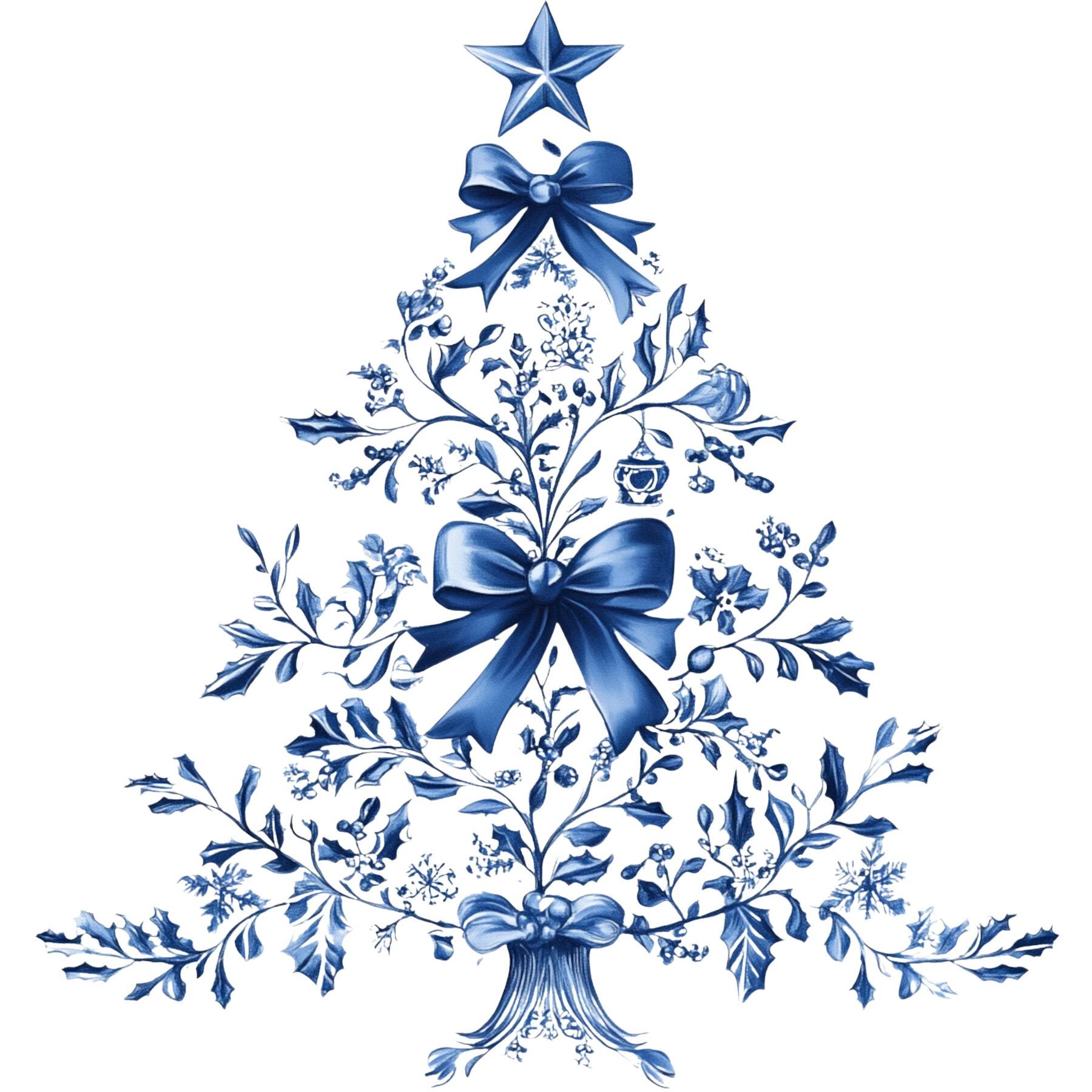 "A refined holiday illustration featuring a classic Christmas tree decorated in the elegant blu...