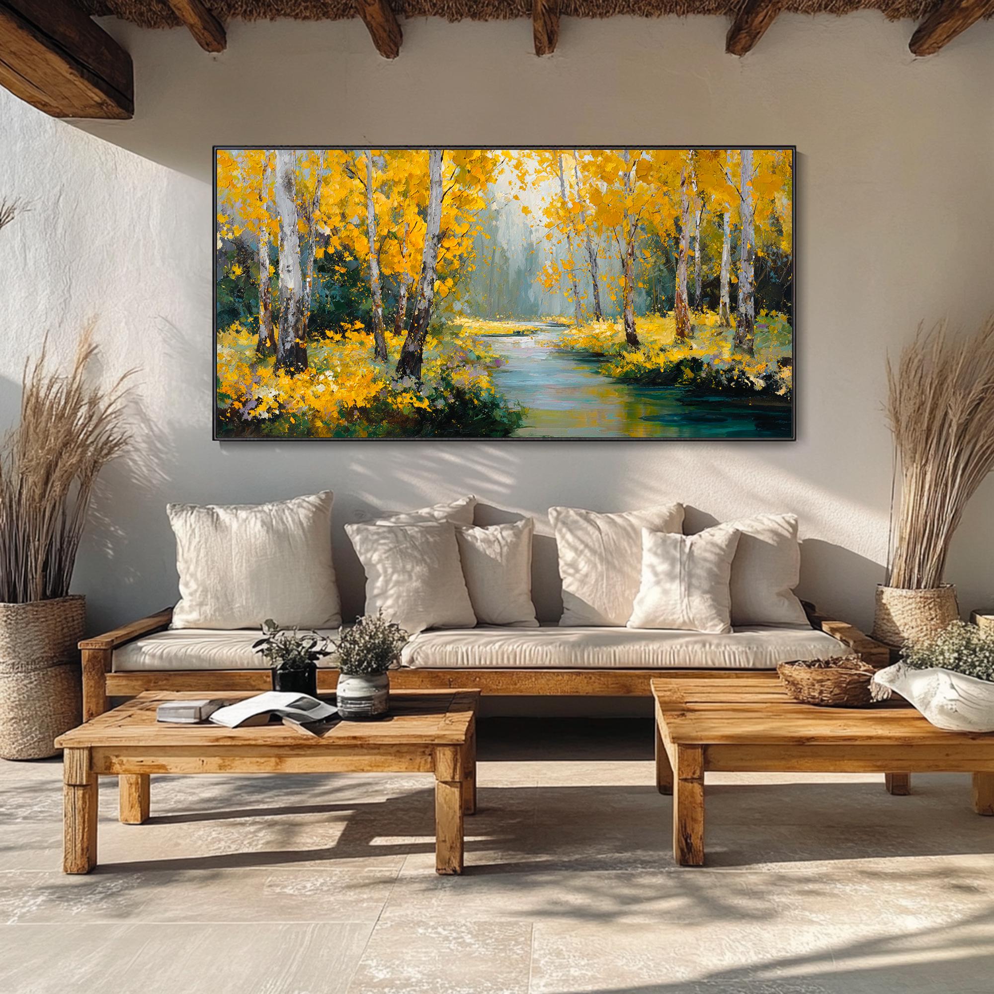 "3D Oil Painting,Autumn Landscape,Yellow Trees,Forest River,Modern Wall Art,Living Room Decor,H...