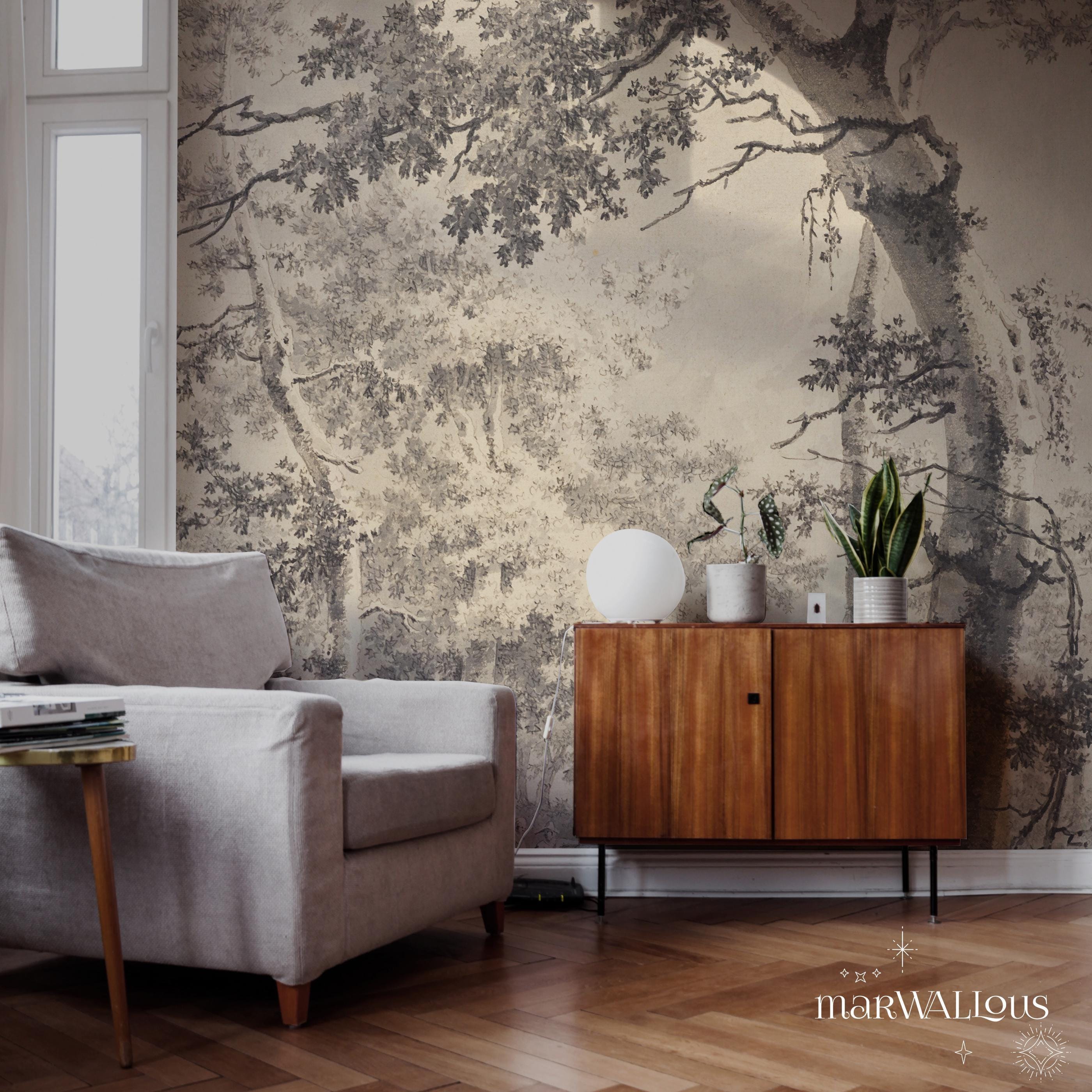 "This charming black-and-white forest scene invites you into a peaceful woodland walk. Towering...